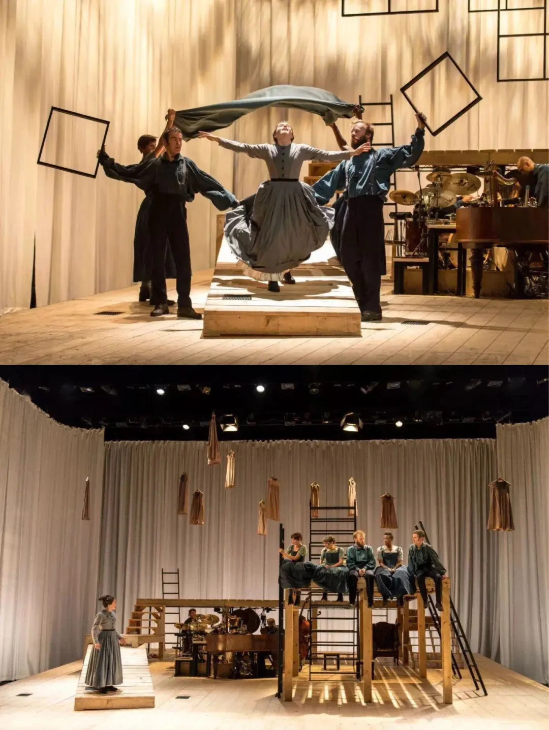 P[四R]《简·爱》中,设计师Michael Vale采用主背景一景到底的想法,仅以简单的铁架、木板、围布来搭建舞台。舞台虽简单,但高低错落的梯子,构建出了强烈的空间感。场景之前巧妙的切换,搭配光影的运用,造就了每个场景不同的意向和隐喻,这也是“极简主义”舞台“less is more”的终极的奥义。