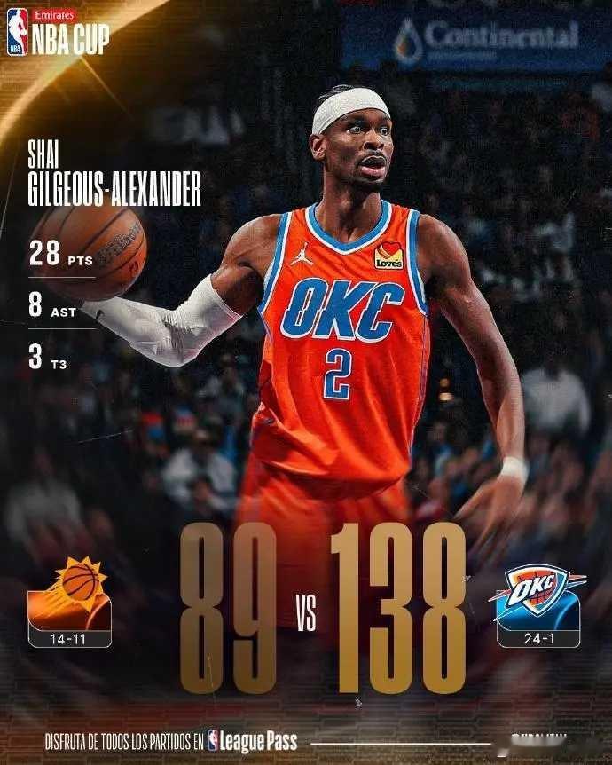 16连胜创队史!雷霆49分狂胜太阳 24胜1负追平勇士神迹 北京时间12月11日,NBA杯1/4决赛上演碾压对决,雷霆主场138-89狂胜太阳,豪取16连胜创下队史最长连胜纪录,同时以24胜1负的开局追平2015-16赛季勇士的历史最佳开局战绩,顺利晋级半决赛。雷霆攻防两端全面压制,首节便建立15分优势,半场领先26分,第三节更是将分差扩大至38分,比赛早早进入垃圾时间。亚历山大三节打卡贡献28分8助攻,霍姆格伦24分8篮板3盖帽且三分4投全中,全队6人得分上双,三分球命中率高达55%。太阳因布克缺阵攻防崩塌,全场失误20次,仅狄龙16分、古德温15分勉强支撑。