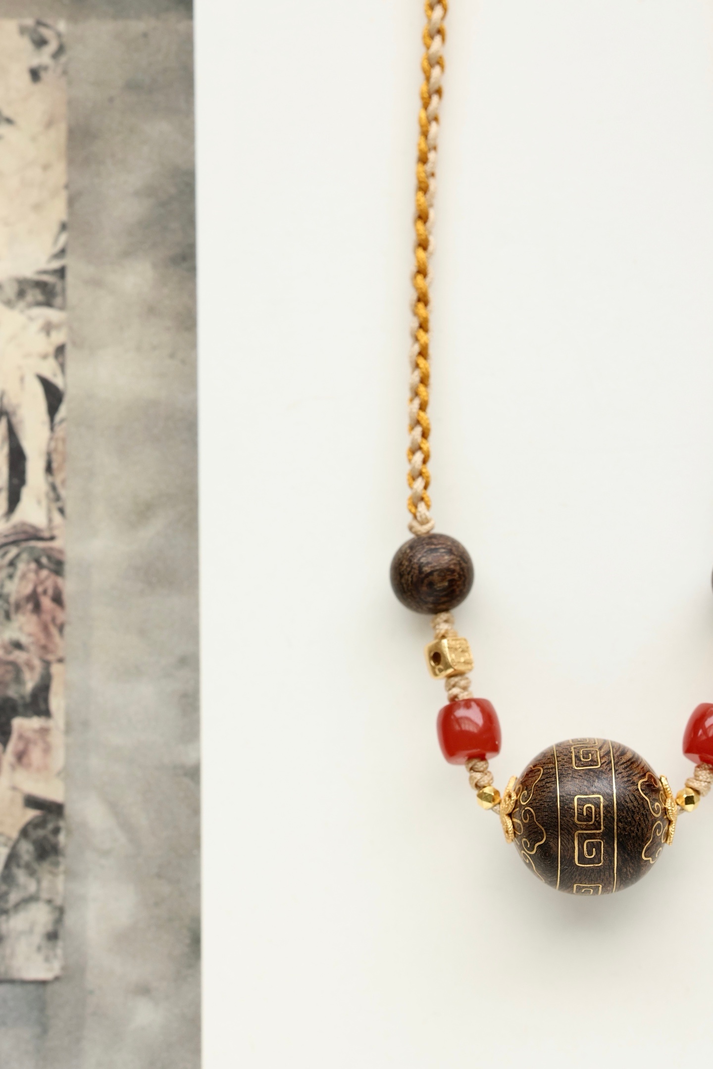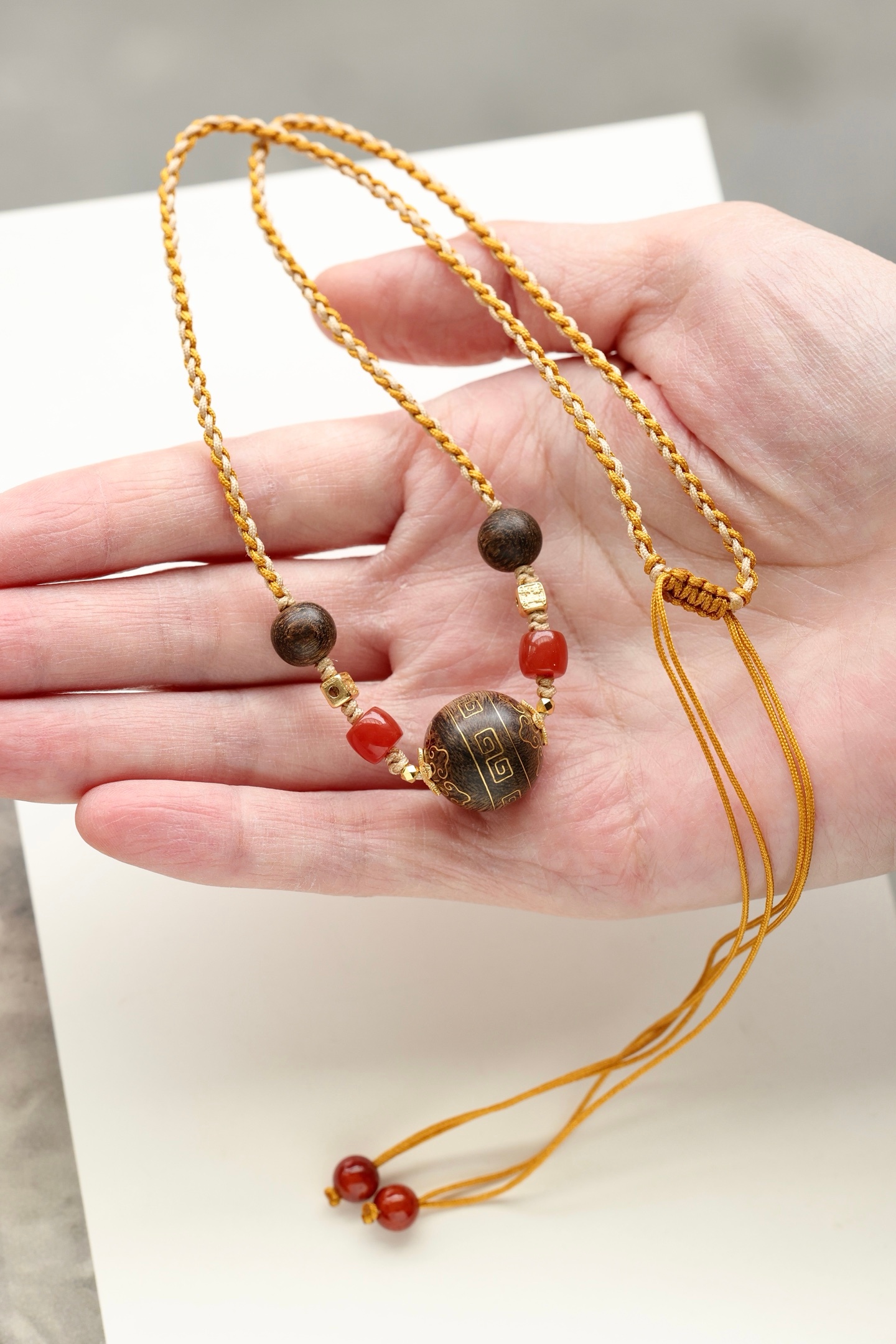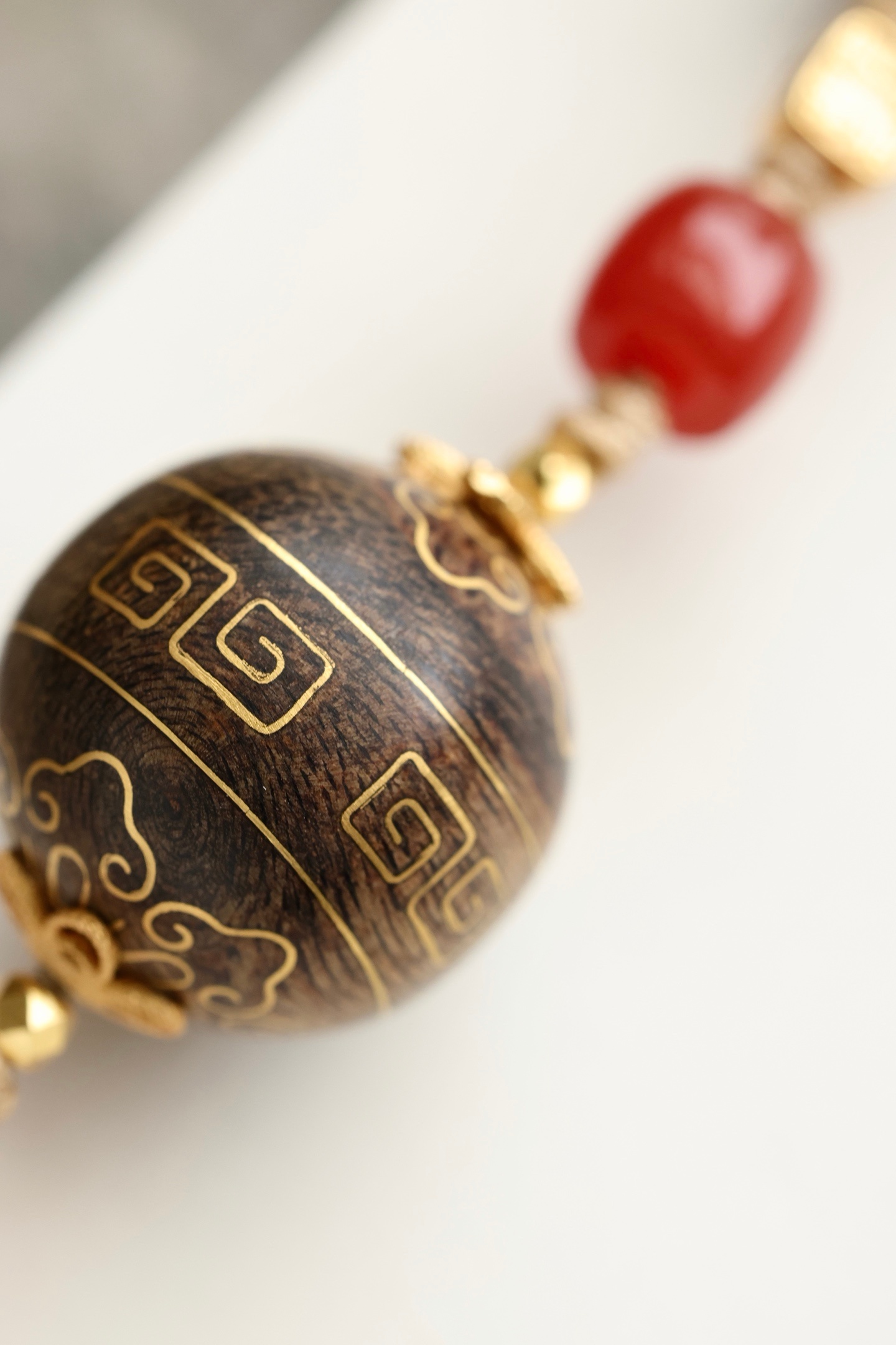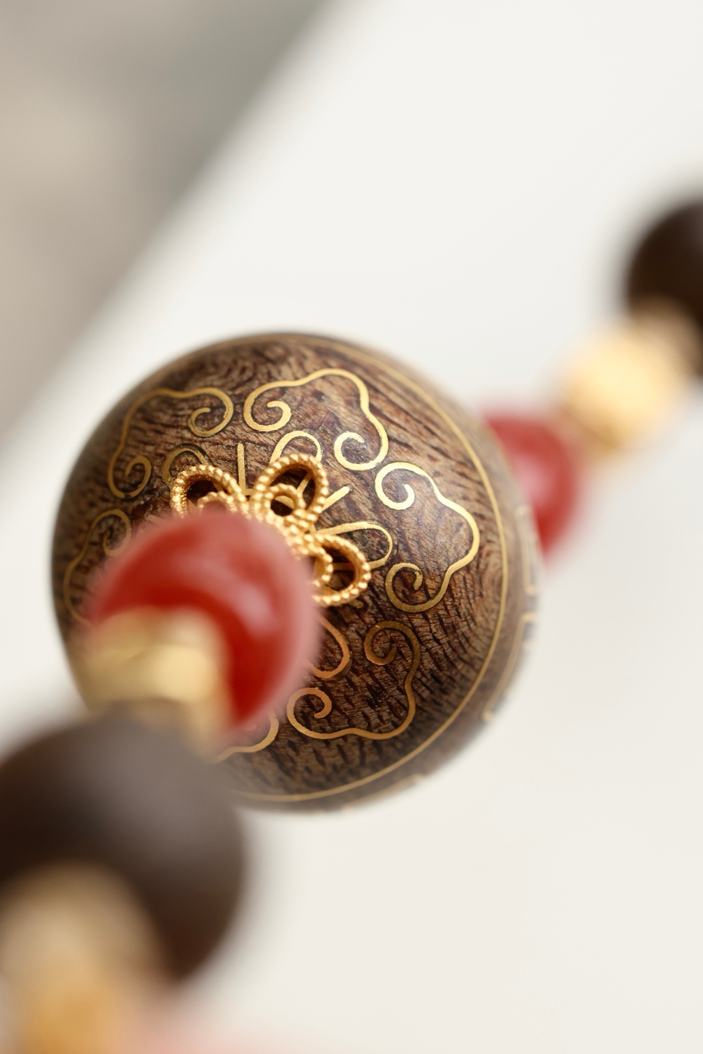 文莱沉香×错金 | 如意回纹 16mm项链沉水17mm单珠,搭配8mm配珠,甜意清晰,蜜韵十足,采用古法错金银工艺,灵芝如意纹、回纹秀美流畅,佩戴大方高级。5g