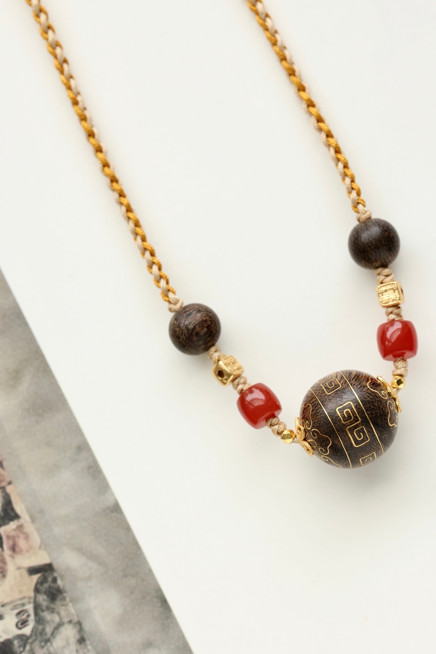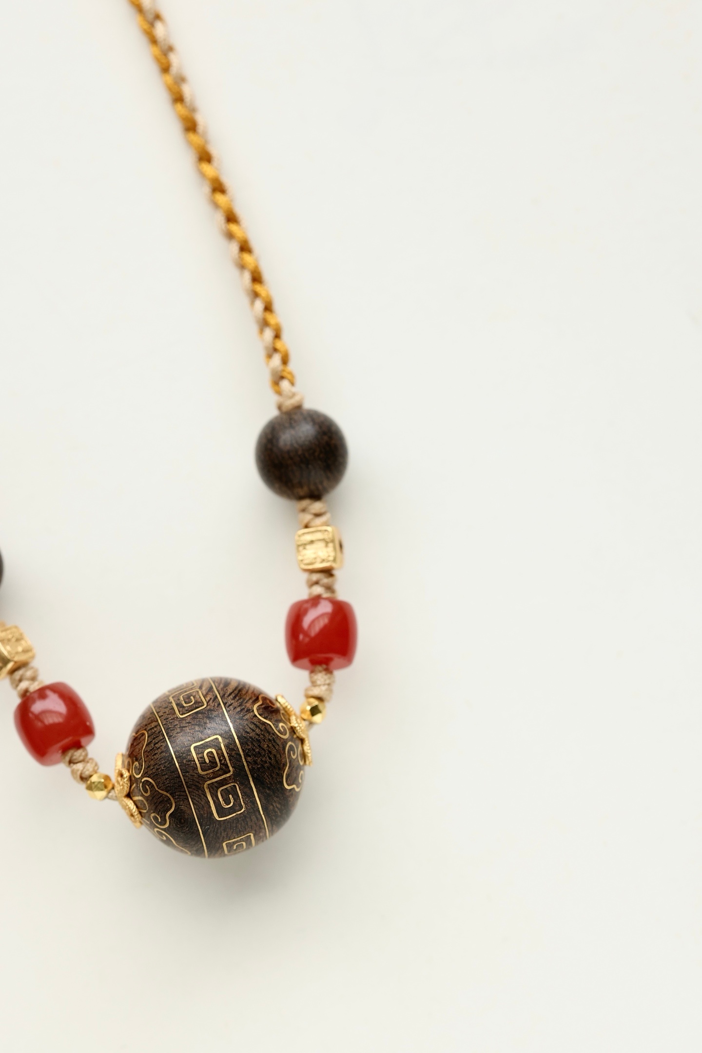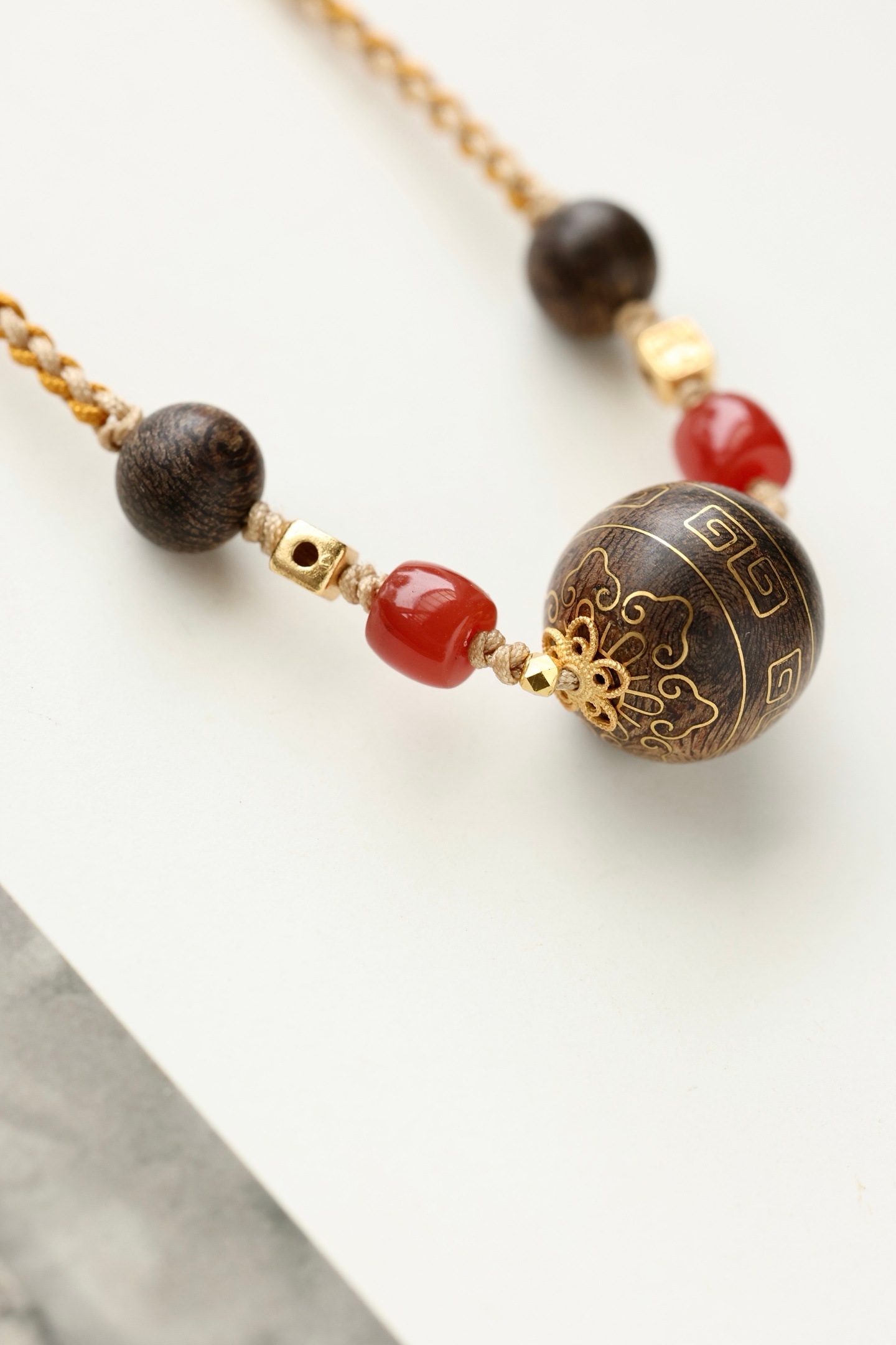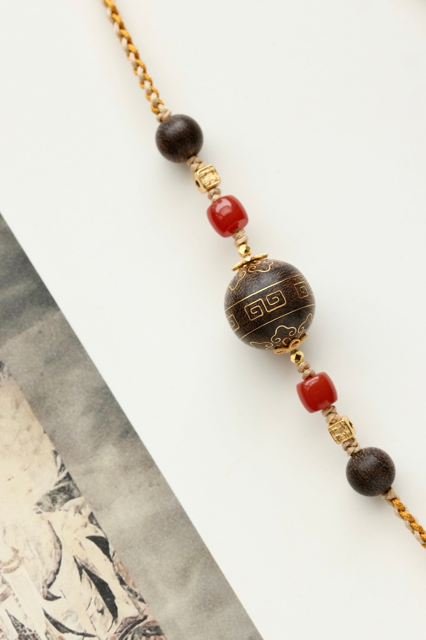 文莱沉香×错金 | 如意回纹 16mm项链沉水17mm单珠,搭配8mm配珠,甜意清晰,蜜韵十足,采用古法错金银工艺,灵芝如意纹、回纹秀美流畅,佩戴大方高级。5g