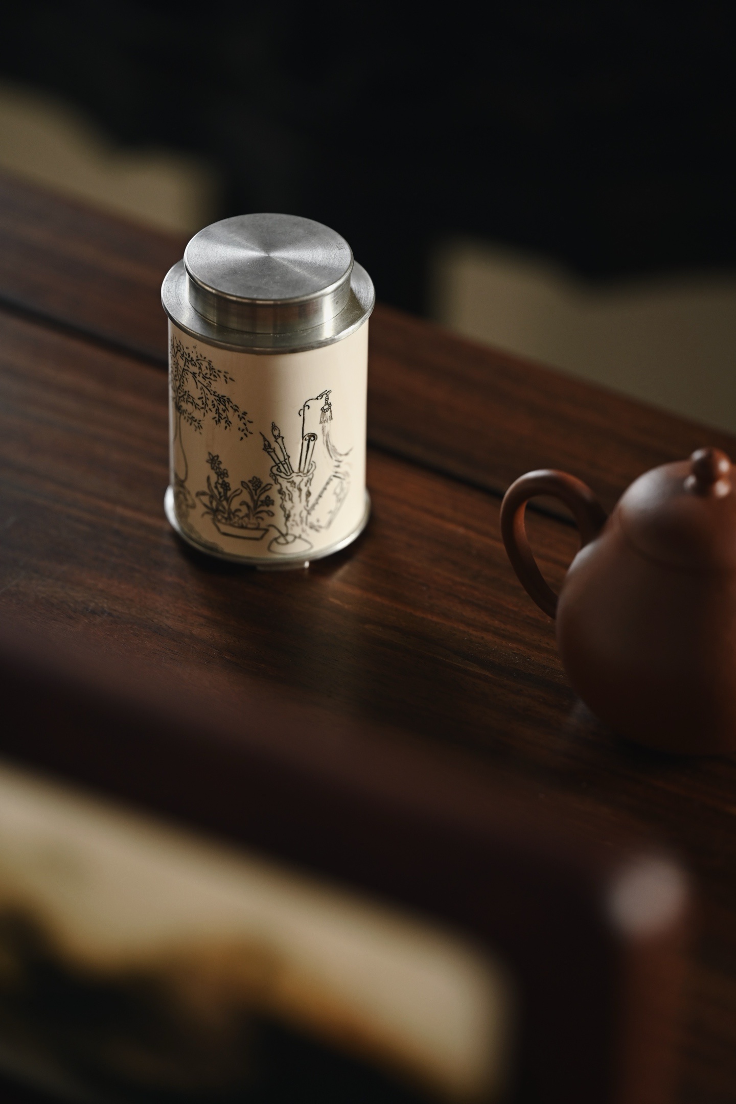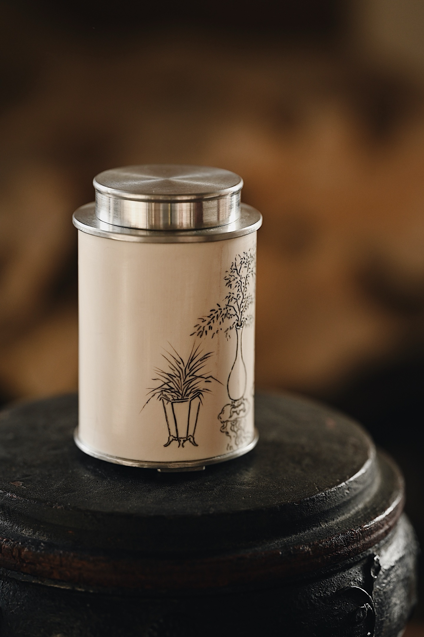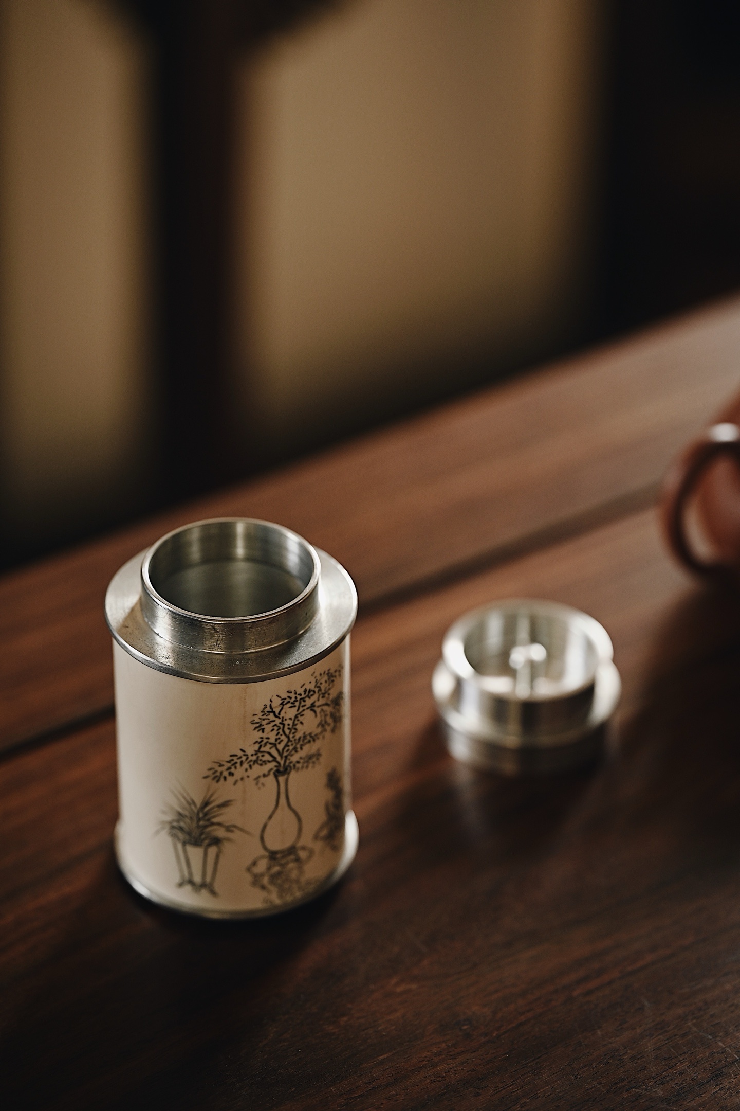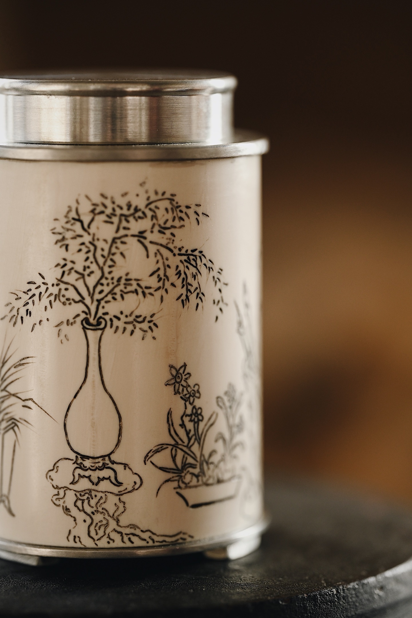 猛犸×锡 | 清供图 茶叶罐料质细腻,罐身采用阴刻技法呈现岁朝清供图,瓶花风格清新,构图布局有致,层次分明,于方寸间经营安排,气韵闲逸,充满文人之趣。5.2*5.2*7.8cm 212g