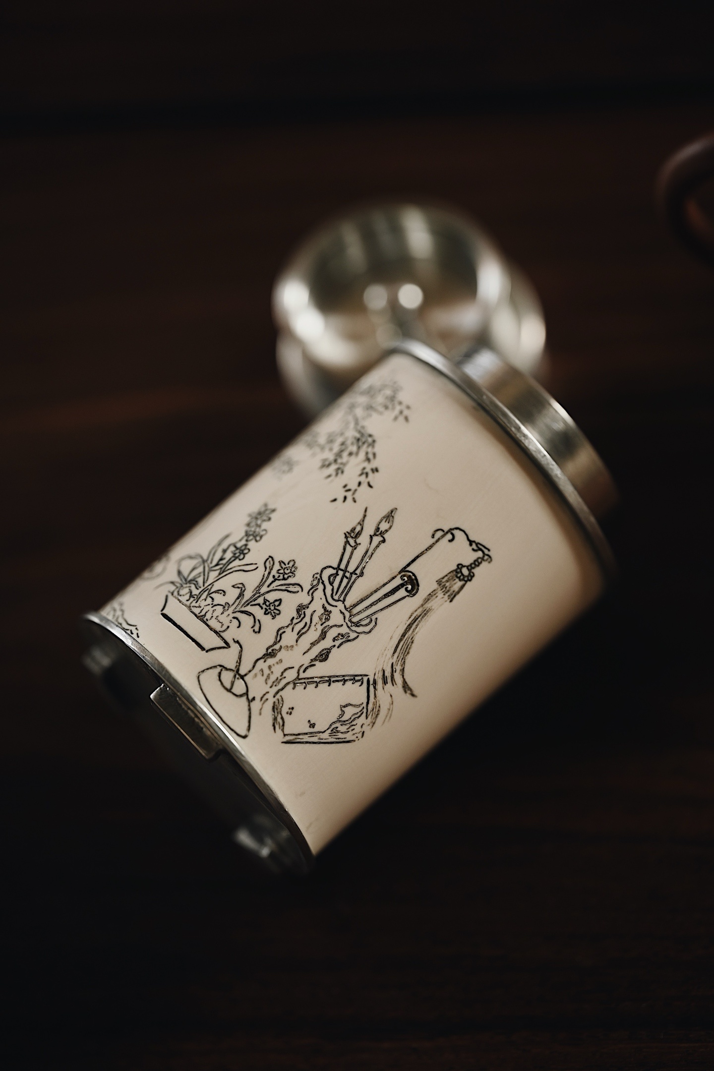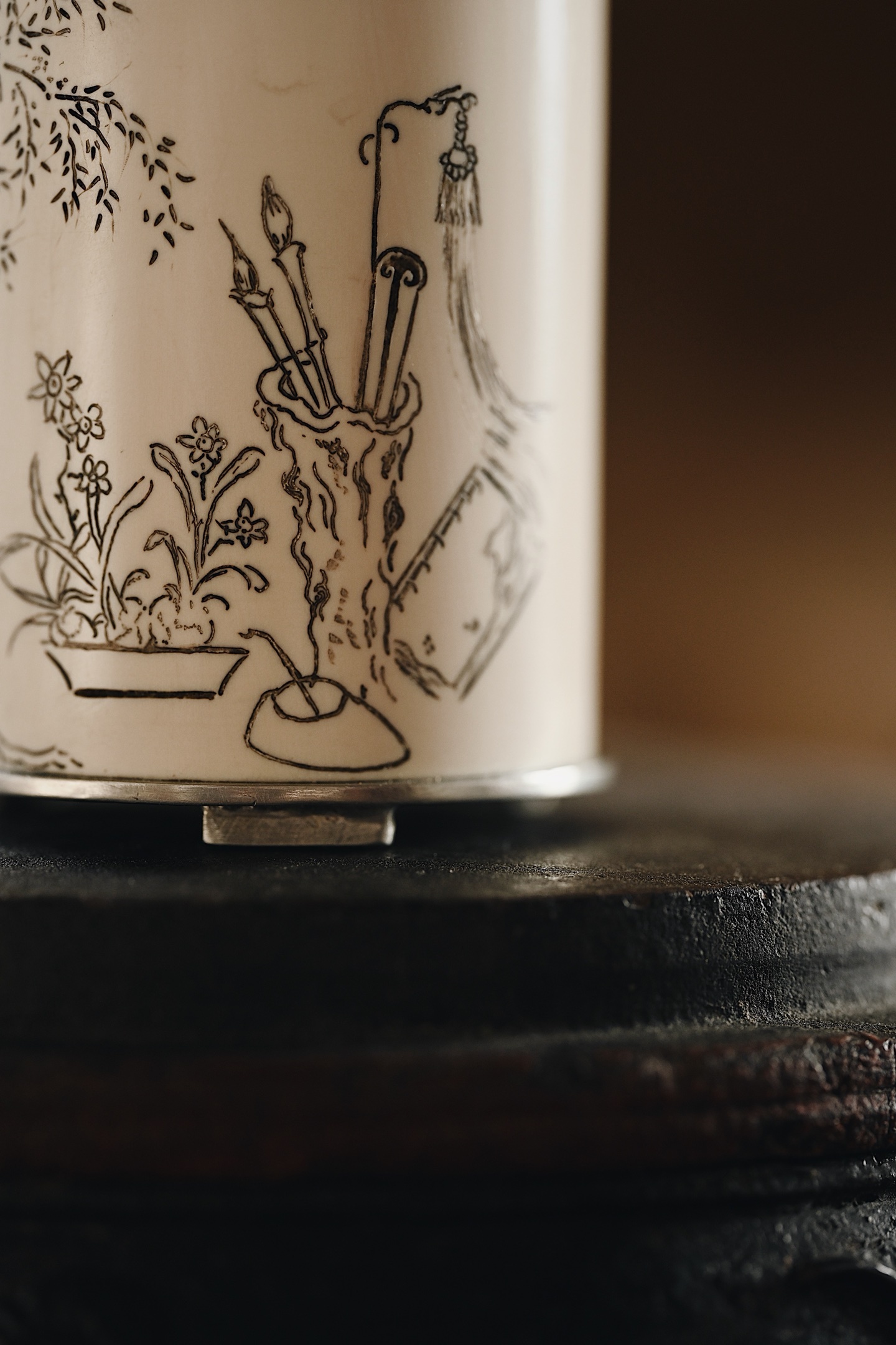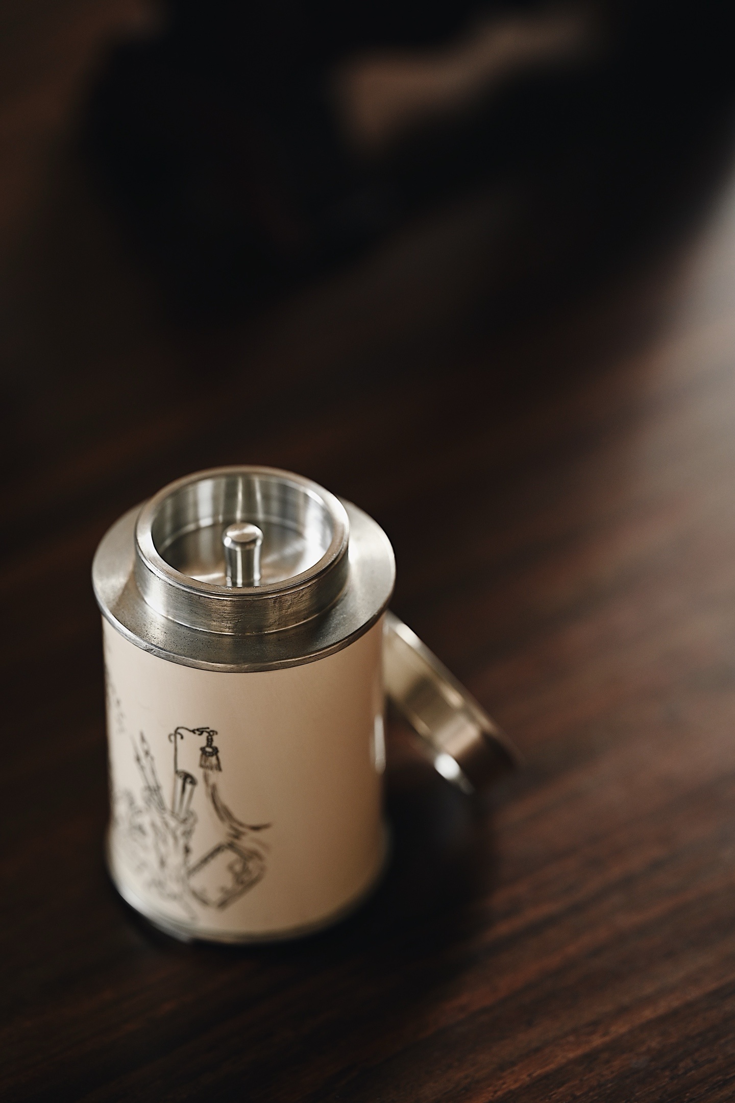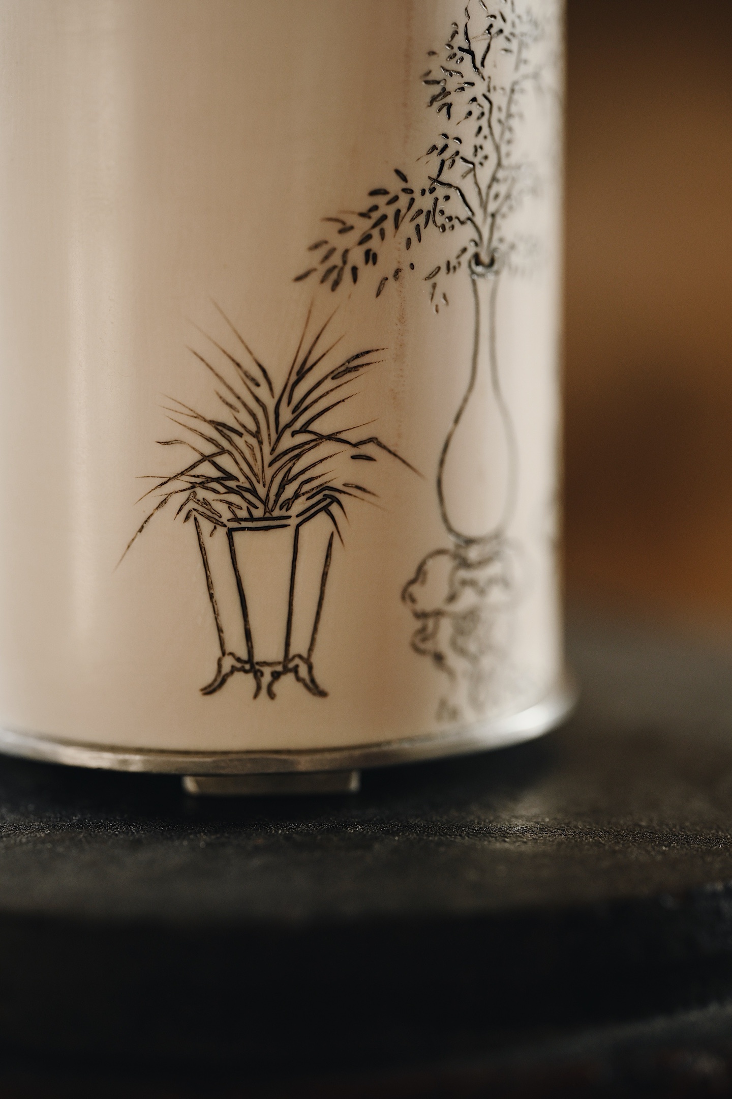 猛犸×锡 | 清供图 茶叶罐料质细腻,罐身采用阴刻技法呈现岁朝清供图,瓶花风格清新,构图布局有致,层次分明,于方寸间经营安排,气韵闲逸,充满文人之趣。5.2*5.2*7.8cm 212g