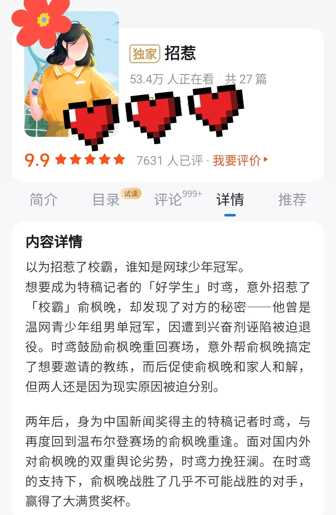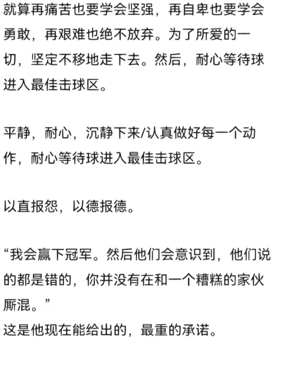 🌸关于网球,很多场比赛的细节都写的很好,很有画面感,有竞技体育的热血和鼓舞人心的力量。最喜欢的章节是后记,整本文的精神内核“耐心等待球进入最佳击区”,天赋很重要,但拥有强大的精神内核,耐心,沉下来做才是赢的关键。