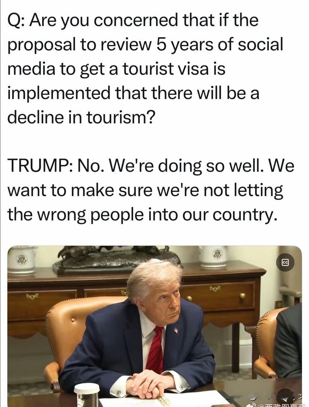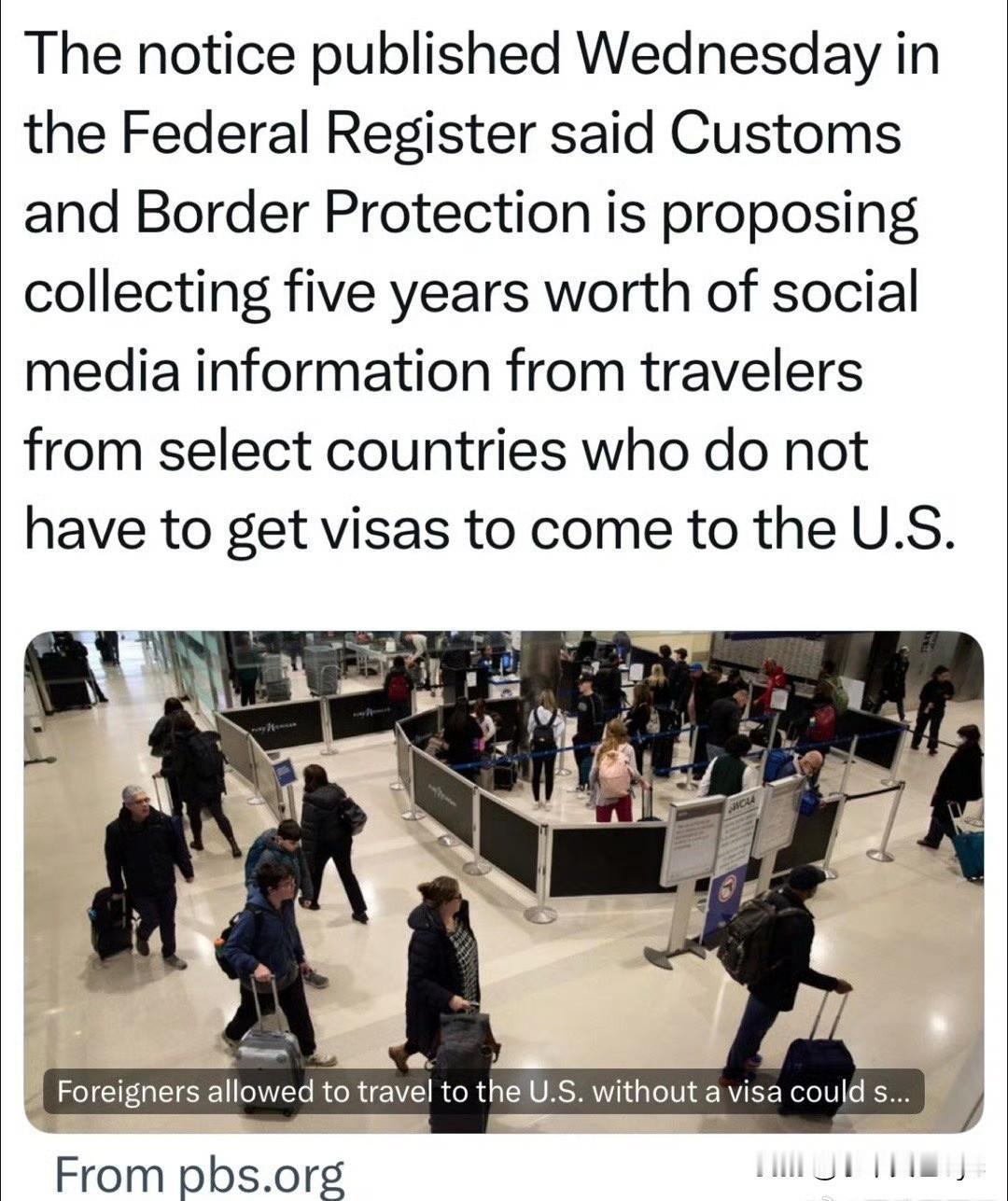 美国海关及边境保护(CBP)提案:现在不需要办签证的外国人,入境时应被查五年社交媒体内容。 适用“九十天免签”项目(VWP)的四十多个国家。他们通过电子旅行授权(ESTA) 系统申请入境许可。 主要针对英法德日韩澳新等国家的免签公民。 这里的重点审查五年社交媒体内容 查询相关信息,社交媒体内容”可能涵盖的范围: · 文字:发布的帖子、评论、转发的文章。 · 多媒体:分享的图片、视频、直播内容。 · 互动与联系:好友列表、关注的账户、加入的群组。 提案明确指出,审查目的是识别可能与恐怖主义、国家安全威胁、犯罪活动或“对美国及其制度持有敌意”相关的内容。在实践中,这可能意味着审查: · 涉及暴力、极端主义或恐怖主义的言论或图像。 · 被视为威胁公共安全的犯罪活动相关信息。 · 与美国移民法相悖的行为信息(例如,讨论非法工作或逾期居留)。 除了社交媒体,提案还计划要求旅客提供更多个人数据,以实现更全面的背景审查: · 联系方式历史:过去五年使用的电话号码、过去十年使用的电子邮件地址。 · 详细的家庭成员信息:包括父母、配偶、兄弟姐妹及子女的姓名、出生日期、出生地和联系方式。 · 生物识别信息:可能包括指纹、虹膜扫描甚至DNA样本。 · 技术数据:提交的照片的元数据(如拍摄时间、地点)及IP地址。 该规定尚未生效。目前正处于为期60天的公众评议期。 这样的审查令人不寒而栗,比法庭审问罪犯都要严厉。这还只是适用于90天免签国家,其他更可想而知了。 美国是一个开放的国度,自诩为民主和自由的国家,出台这样的决定,与开放、自由的理念吻合吗?谁还敢去美国?犯不着为自己惹麻烦。 总统倒是自信 记者问不担心影响旅游业吗 总统:不担心,旅游业很火,不能让错误的人进来。