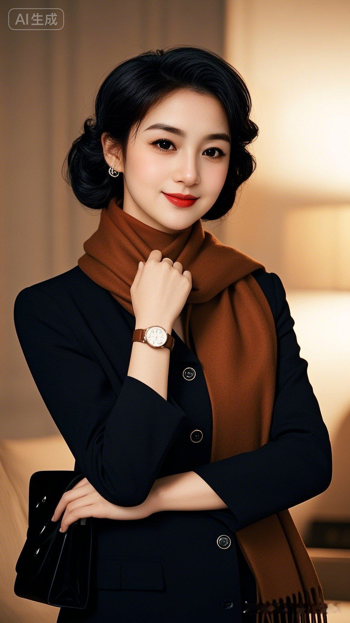 优雅女性正面而立,盘发柔顺,精致妆容衬着温和笑意,黑外套配棕围巾,端庄大气。