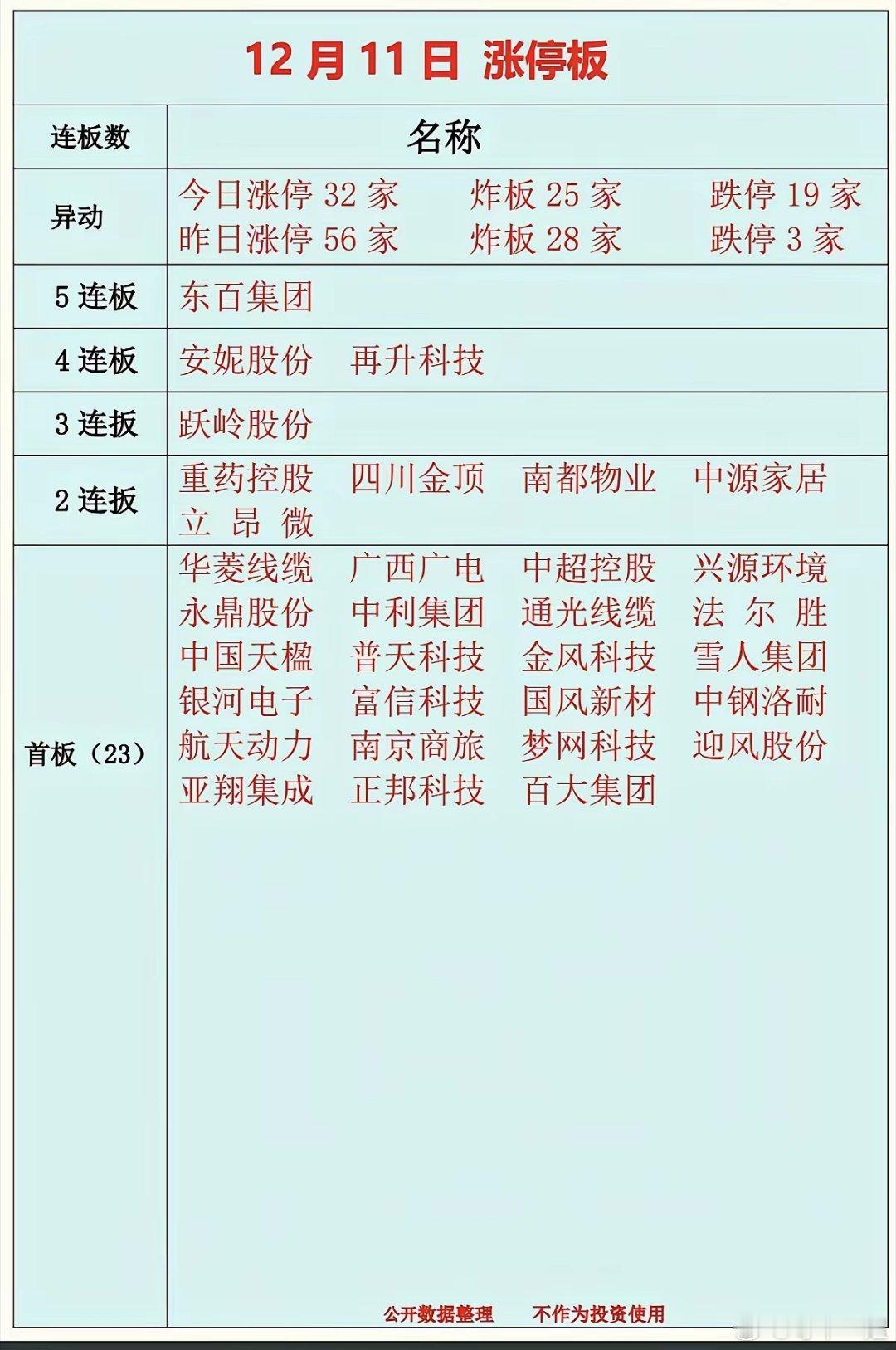 12.11周四 涨停板股票:题材+高度!今日涨停32家 炸板25家 跌停19家昨日涨停56家 炸板28家 跌停3家房地产板块一日游行情。5连板 东百集团4连板 安妮股份 再升科技3连扳 跃岭股份