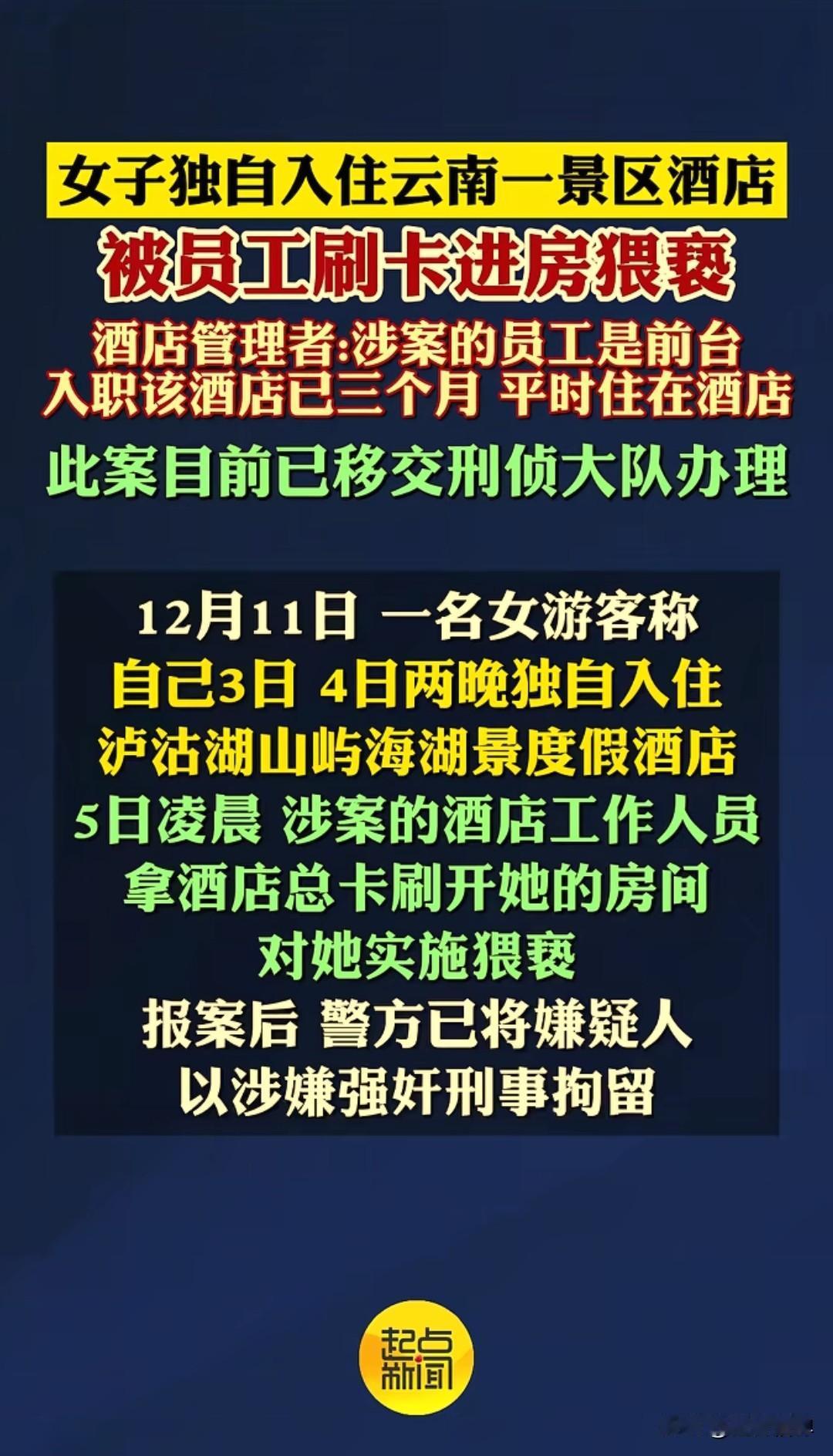 据多家媒体报道:一名女游客说她去旅游,独自住在云南丽江一景区酒店,12月3号4号住了两天,5号凌晨的时候,酒店一男性前台工作人员拿着房卡打开了她的房间,对她实施了猥亵行为。 事发后,她的朋友立刻报了警,警方接到报警后,宁蒗彝族自治县公安局认为符合刑事立案条件,已对嫌疑人涉嫌强奸案侦查,警方调取床单、监控等证据,并对其采取了刑事拘留措施。 案件已移交至宁蒗彝族自治县公安局刑侦大队办理,酒店管理员承认事件属实,说这名涉案员工是酒店前台,入职才三个月。 刷卡进入女游客房间的卡是酒店总卡,一般是由酒店前台持有,用于客人看房或者应对其他突发事件,但是按酒店规定,没有经过客人允许不准擅自进入客人的房间。 目前涉事酒店已暂停营业,预定平台已无法订房,酒店表示会立即配合处理,丽江泸沽湖景区工作人员表示高度关注此事,会积极配合公安处理。