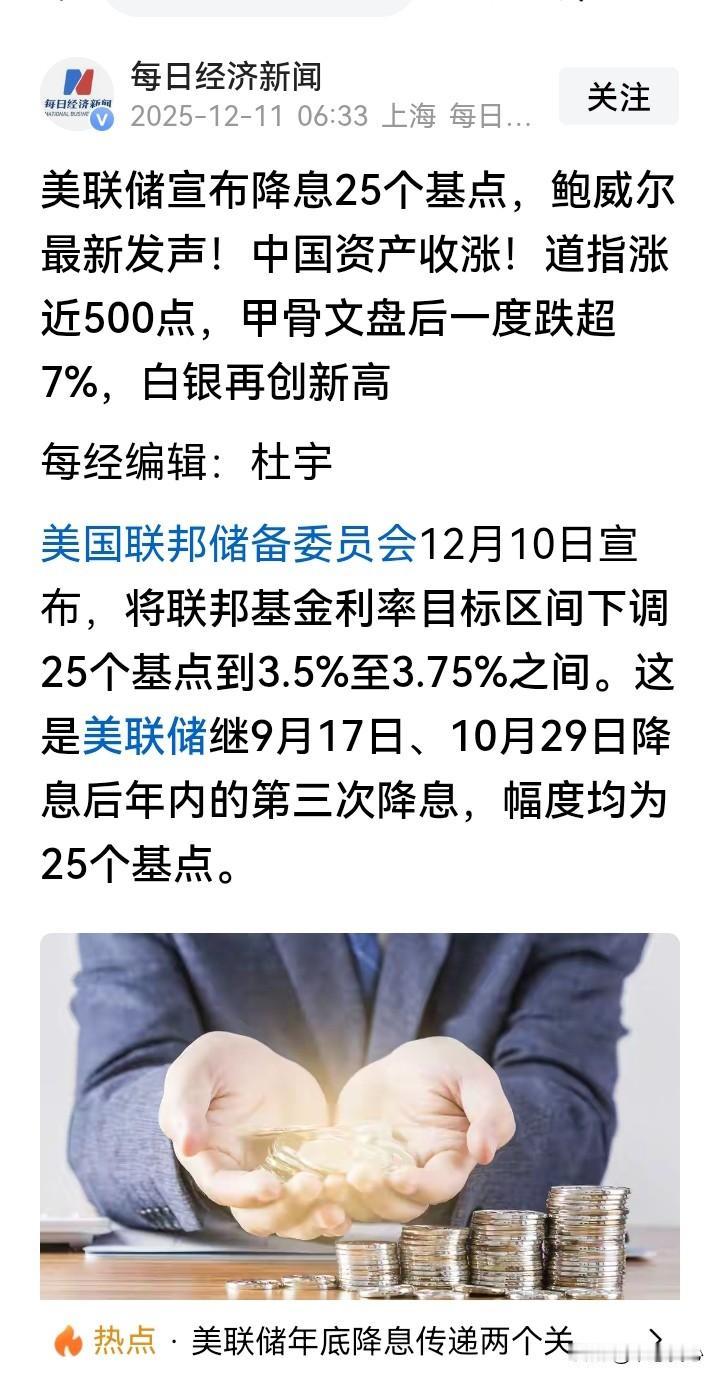 睡觉💰看了一下,更加不明白了,为何今天跌幅还比较大 因为今天一早的消息,就是美联储又降息了。 按照以往,这会被解读为大利好,虽然不是我们的央行降息,但是美联储降息一般都是被认为是很重要的,支持市场表现的因素。 因此,今天不涨反跌? 或者真的是因为年底回笼资金吗?
