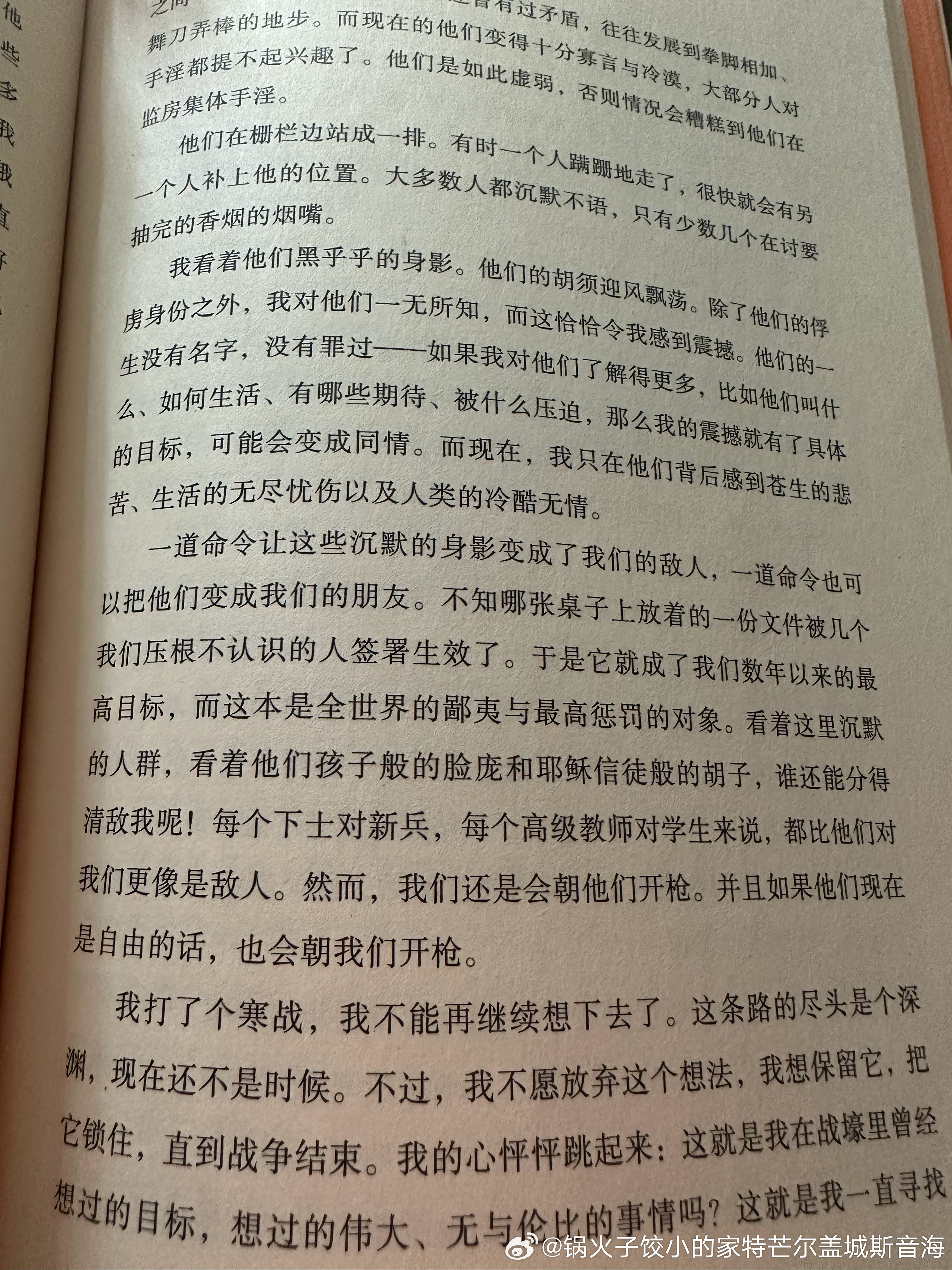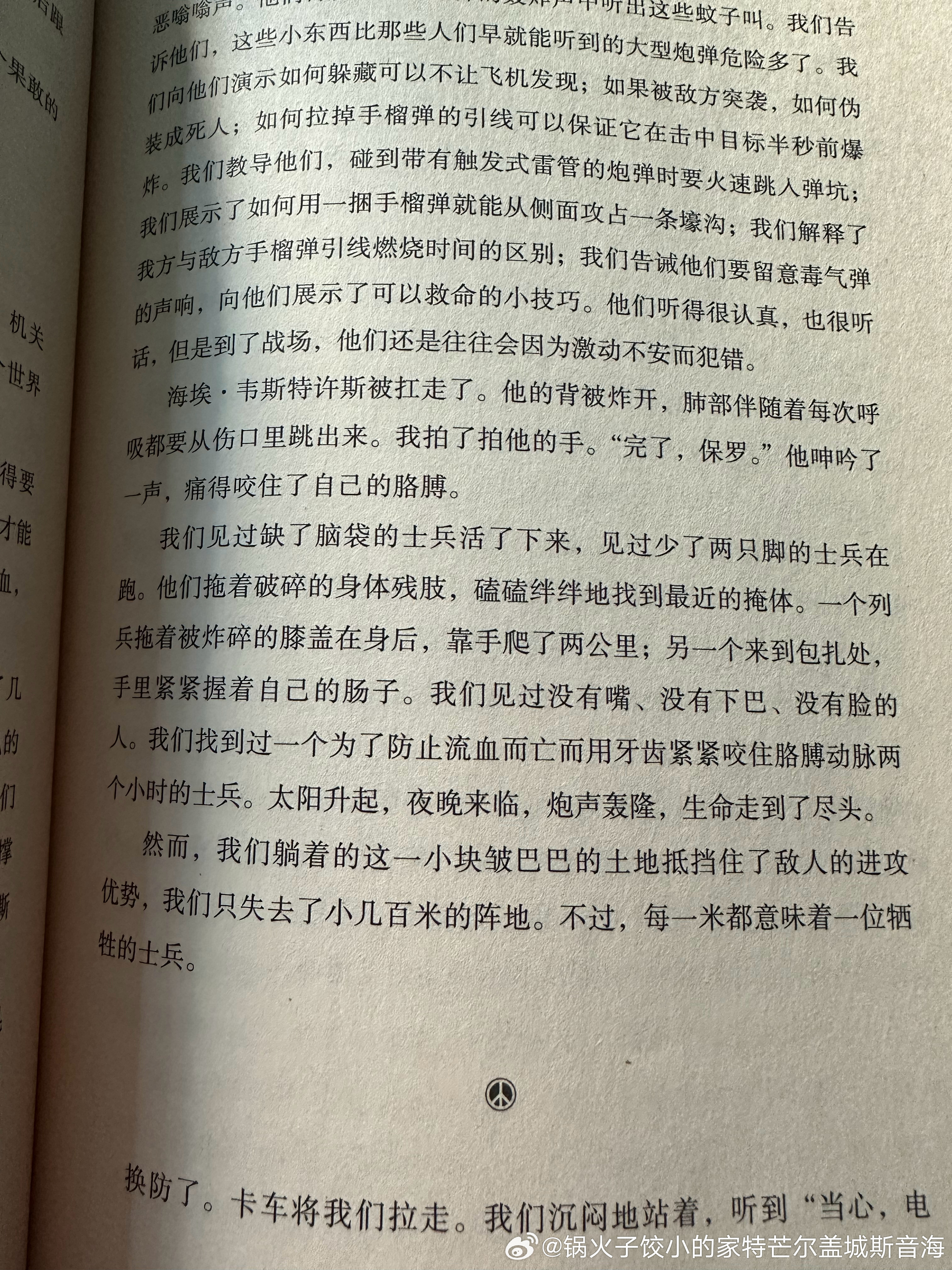 当生命一文不值的时候才知道活着是一件多么难得的事。生活中一切稀松平常的事,当战争来临的时候,都变得弥足珍贵失掉了整整一代人的欧洲,在第一次世界大战之后,什么也没有得到。但我觉得,不就的将来,欧洲还会尸横遍野,区别就是尸体是欧洲人,还是地球之癌。读不读《西线无战事》,我都是反战的150k