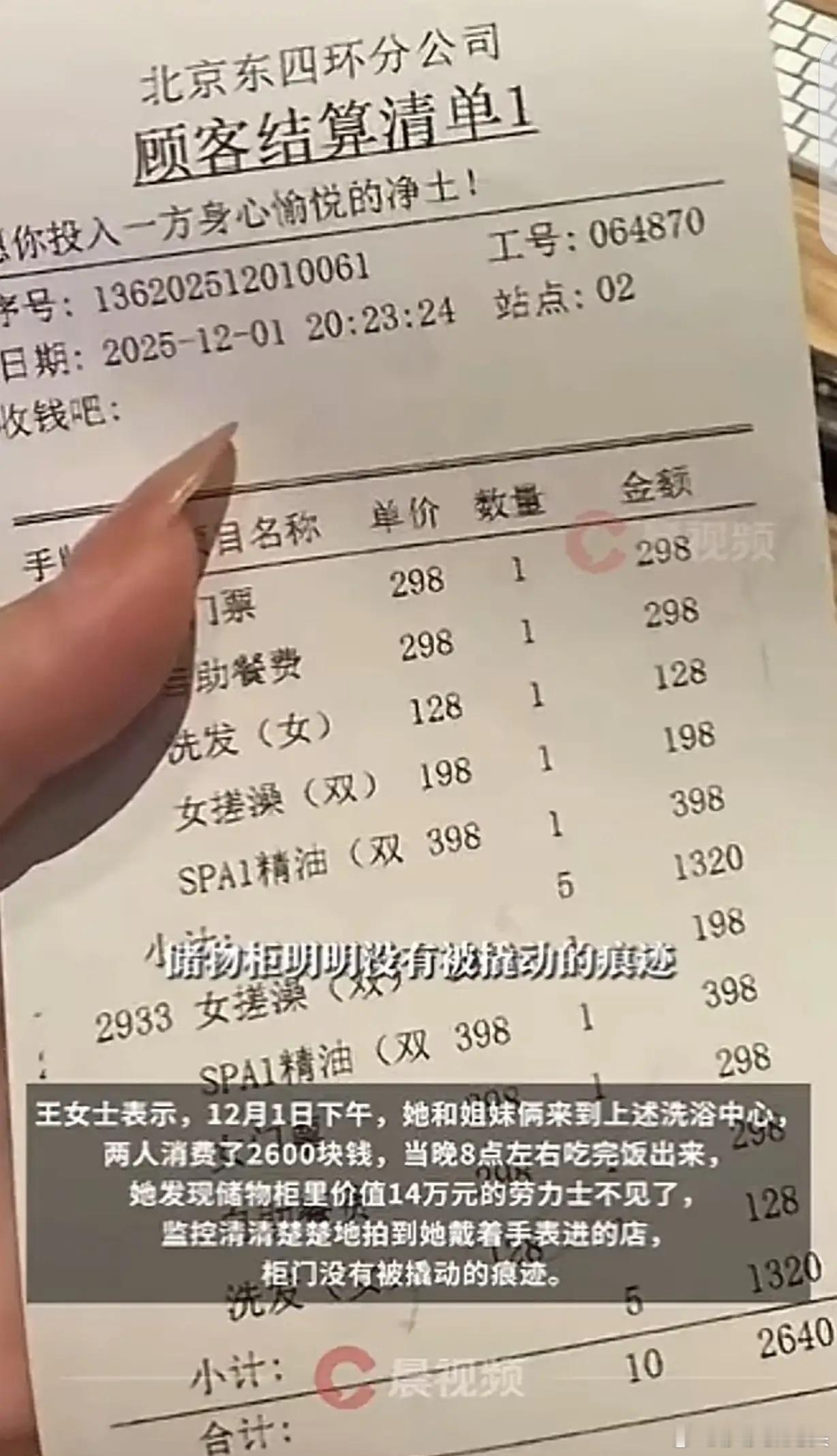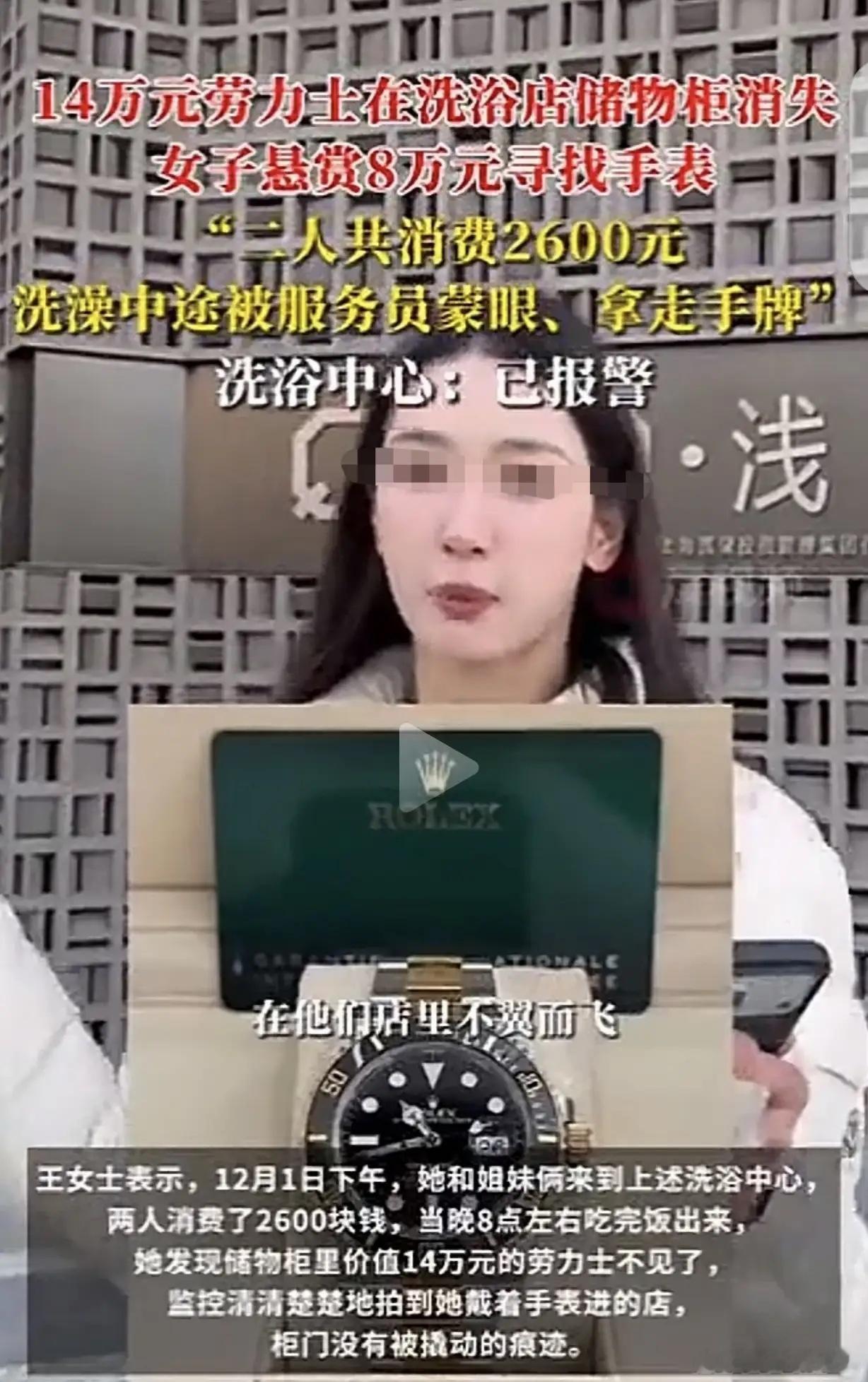 北京,一女子花2600元,和朋友去洗浴店洗澡,她洗完竟发现,自己的价值14万劳力士手表不见了,而柜子没撬动痕迹,女子心里咯噔一下,她怀疑自己搓澡时,服务员蒙住了她的眼睛,然后悄悄拿走了她的手牌,把劳力士偷走了,女子悬赏80000元想找回自己的手表。没想到洗浴店竟然先报了警。网友:不用蒙眼,打开你的柜子,不用你的手牌。 王女士并非北京本地人,此次或是来京旅游,或是想犒劳忙碌后的自己,便约上朋友前往这家口碑不错的洗浴店。 2600元的消费额度,相当于一名保洁员一个月的辛苦收入,足以见得这家店的定位与服务水准。 她手腕上的劳力士意义非凡,是家人在她本命年时赠送的礼物,平日里珍视有加,只是这次洗浴前,她没有选择将手表交给前台专人保管,而是摘下后仔细锁进了储物柜,满心以为这样便能万无一失。 洗浴过程中,王女士体验了搓澡与洗头项目。 期间,服务人员以避免泡沫溅眼或方便操作为由,用热毛巾或眼罩蒙住了她的双眼,同时提议让她摘下手牌,要么代为保管,要么放进浴袍口袋。 王女士并未多想,觉得这是服务中的常规操作,尤其担心手腕处搓洗不干净,便顺从地照做了。 一个多小时的舒适体验后,她与朋友前往餐厅简单用餐,还曾念叨服务周到,可当返回更衣室准备取物时,眼前的景象让她瞬间僵住——储物柜里空空如也,那块贵重的手表早已不见踪影。 发现失窃后,王女士与朋友在洗浴区、储物柜周边翻遍了所有可能的角落,却始终没能找到手表的踪迹。 情急之下,她与洗浴店展开沟通,核心怀疑集中在搓澡期间:那段时间她视线受阻,手牌脱离了自己的直接掌控,唯一有机会接触储物柜的便是当时提供服务的工作人员。 但洗浴店方面并未认可这一怀疑,反而率先选择了报警,这一行为让双方的矛盾瞬间升级。 警方赶到现场后,立即展开调查。 通过公共区域的监控,能够清晰证实王女士进店时确实佩戴着那块劳力士,但洗浴区属于隐私区域,并未安装监控设备,使得失窃的关键时间段处于“监控盲区”,无法捕捉到有效线索。 刑侦人员对储物柜进行了细致勘查,未发现撬动痕迹或可疑指纹,随后询问了当事搓澡师傅,对方明确否认了盗窃行为,其他工作人员也表示未曾见过这块手表。 由于涉案金额高达14万元,已达到盗窃罪“数额巨大”的标准,警方很快出具了立案通知书,但案件始终没有实质性进展。 眼见找回手表的希望愈发渺茫,12月4日凌晨,王女士在社交平台发布视频,宣布悬赏8万元寻找线索——无论是能找回手表本身,还是能提供有效破案信息,她都愿意兑现这笔赏金。 视频中,她还展示了手表的购买发票与细节照片,言语间满是焦急。 这8万元悬赏既是她急于挽回损失的无奈之举,也透着对这块承载特殊情感手表的珍视,毕竟它不仅价值不菲,更凝聚着家人的心意。 从法律角度来看,若盗窃行为查实,嫌疑人将面临三年以上有期徒刑; 而洗浴店即便提前叮嘱过保管财物,但其存在监控盲区、允许工作人员代管手牌等情况,显然未能尽到安全保障义务,需承担相应的补充赔偿责任。 这起失窃案也给所有消费者敲响了警钟:高端消费场所并不等同于绝对安全。 外出携带贵重物品时,能随身保管就绝不离身,若确需寄存,务必选择有专人看管、能登记备案的正规渠道; 面对服务中要求蒙眼、代管随身物品等可能脱离自身掌控的情况,更要多留一个心眼。 毕竟,财物安全最终还是要靠自己谨慎防范,才能避免类似的意外发生。 目前,警方仍在全力侦查此案,我们也期待真相早日水落石出,给当事人一个公正的结果。