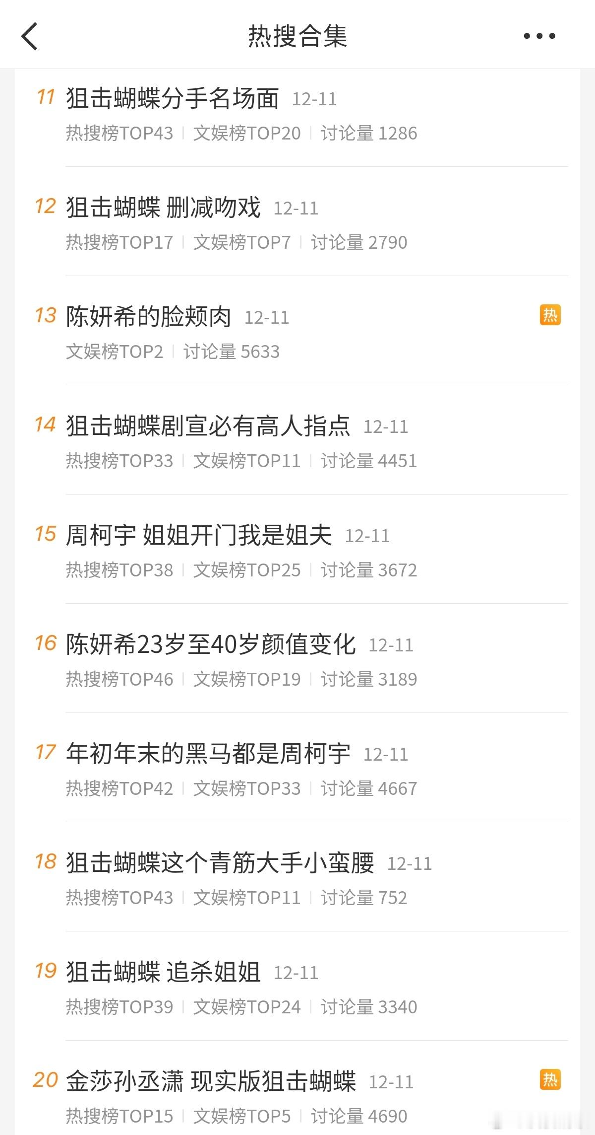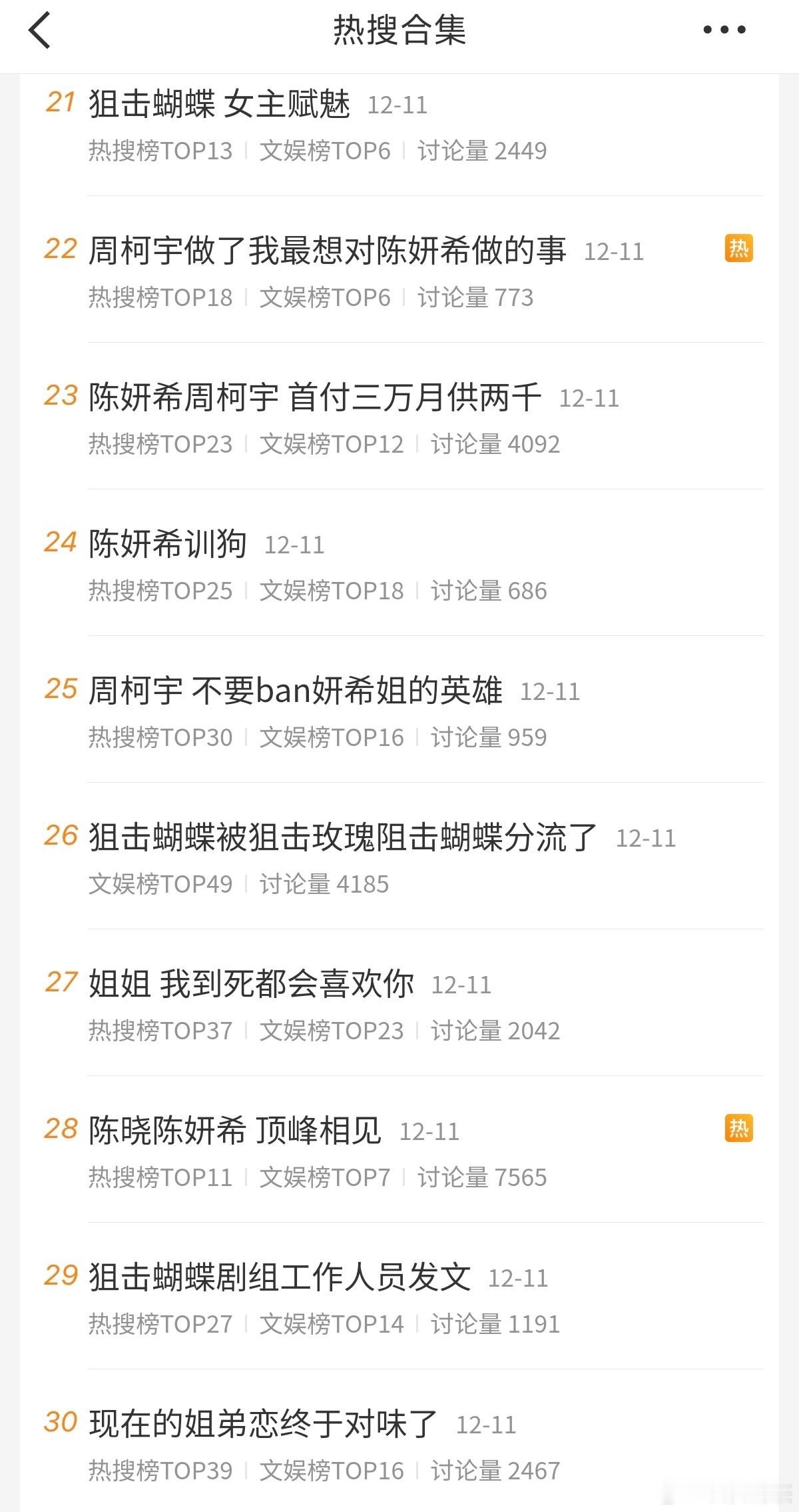 狙击蝴蝶今天一天微博热搜30个,不过剧播有讨论热度(正面),赚发了。