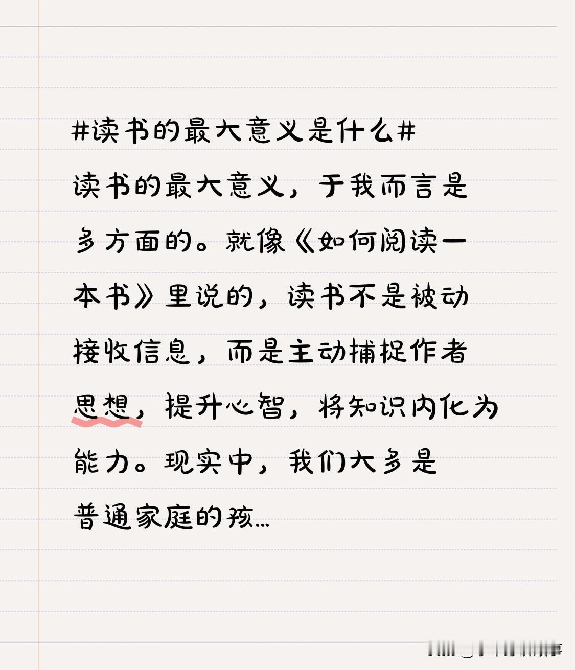在我看来,读书的最大意义是多维度的。正如《如何阅读一本书》所言,读书并非被动接受信息,而是主动探寻作者思想,提升心智,将知识转化为能力。 现实中,我们多出身普通家庭,没有好“底牌”。读书是最公平的逆袭途径。它未必能让我们名利双收,却能让我们言行有分寸、做事留余地。读书让我们成为温暖、有趣、善思考的人,在生活波折中保持内心笃定。困境中,它赋予我们力量。读书似给灵魂开窗,让我们见识广阔天地,书写自己的人生篇章,以勇敢、清醒、温柔之姿开启人生之书。