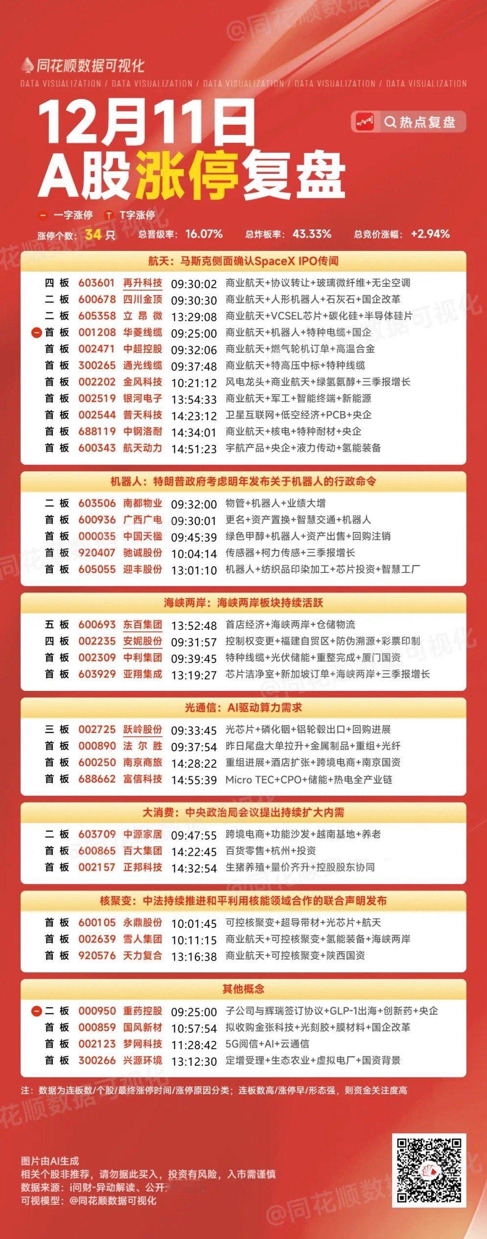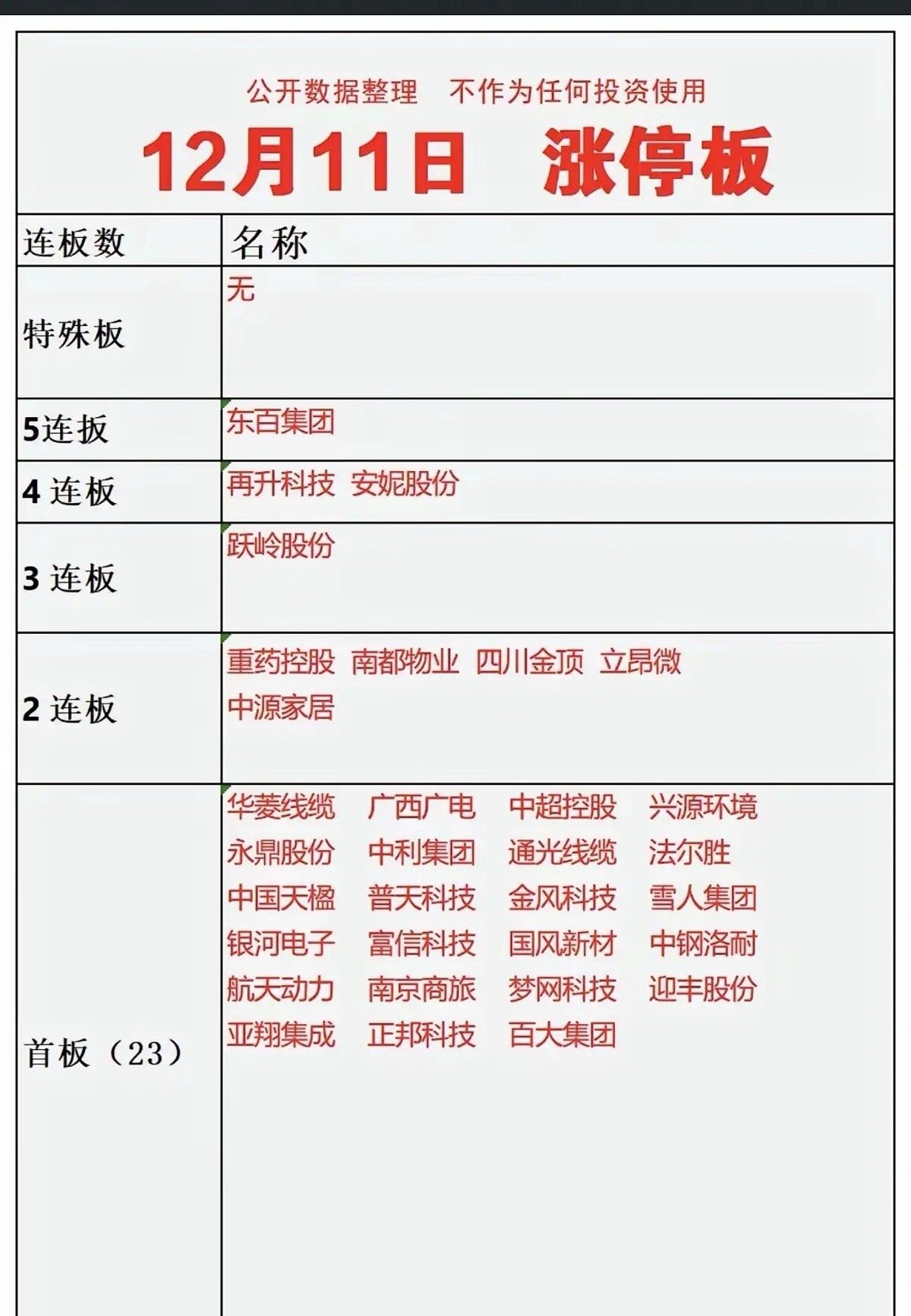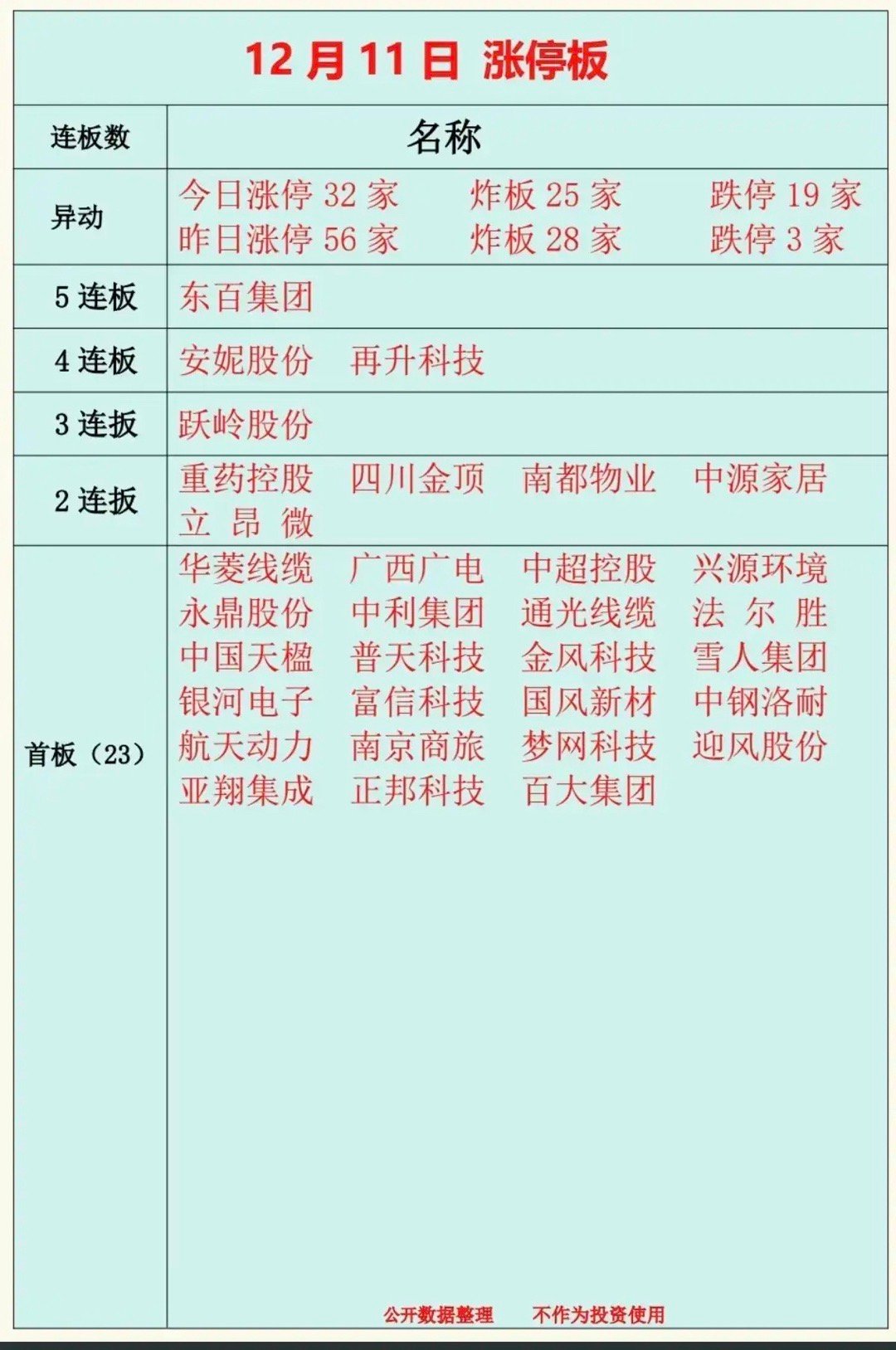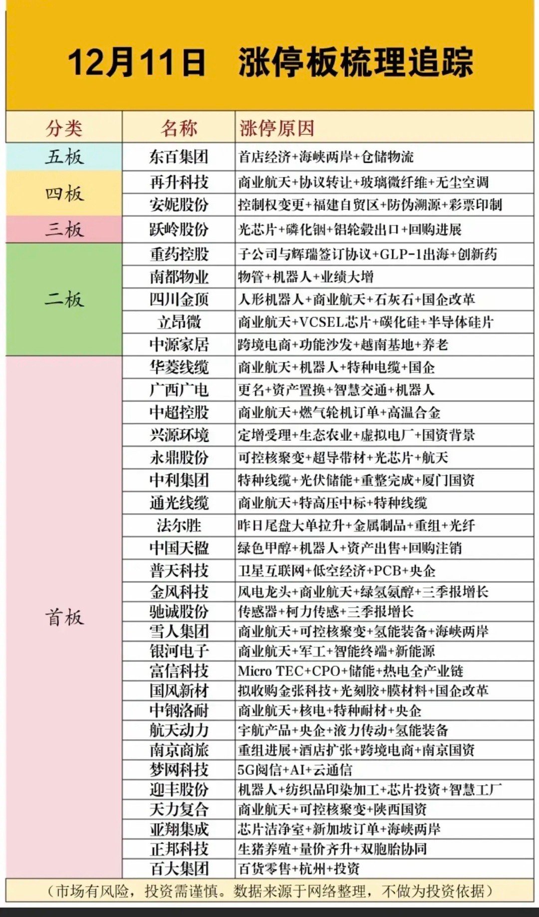 12月11日,今日涨停复盘(涨停34个),包括商业航天、机器人、海峡两岸、光通信等板块,美联储公布降息,市场情绪低迷。1、五连板:东百科技2、四连板:安妮股份、再升科技3、三连板:跃岭股份4、二连板:四川金顶、南都物业、立昂微、中源家居、重药控股5、首板:华菱线缆、通光线缆、银河电子、雪人集团、中国天楹、梦网科技、普天科技、航天动力、百大集团、国风新材等…