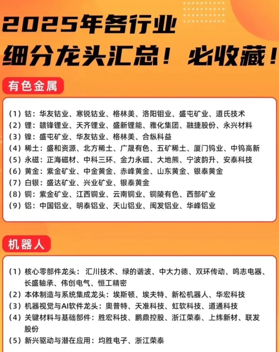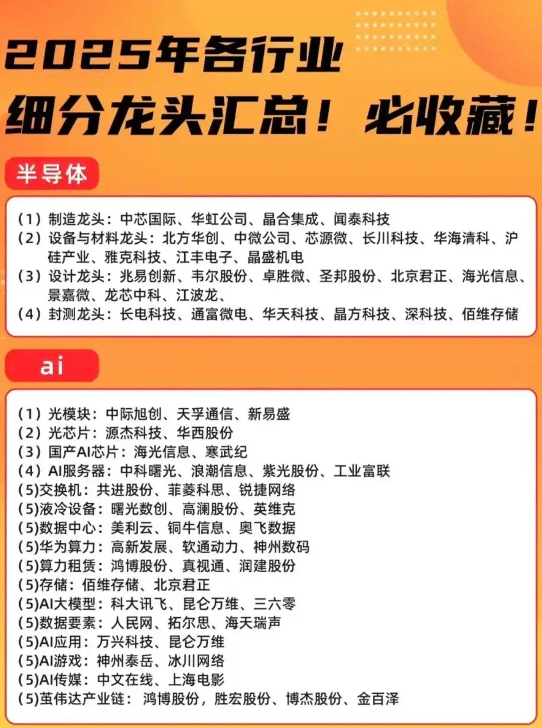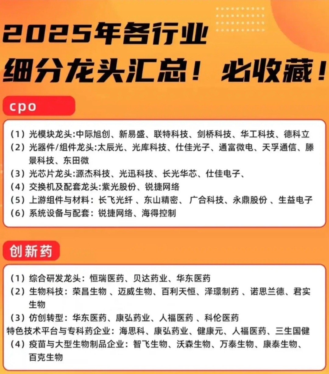 慢牛行情,各行业细分优质龙头企业:一、CPO光学封装:中际旭创、新易盛、剑桥科技、仕佳光子二、创新药:创新医疗、恒瑞医药、华东医药、康弘药业三、有色金属:华友钴业、赣锋锂业、北方稀土、中国稀土、紫金矿业、洛阳钼业四、机器人:卧龙电驱、金发科技、中大力德、汇川技术、双环传动、绿的谐波、上纬新材五、人工智能:海光信息、寒武纪、中际旭创、新易盛、天孚通信、科大讯飞、昆仑万维、三六零六、半导体:1,中芯国际:国内最大的的晶圆代工企业;2,寒武纪:专注于智能芯片研发的AI芯片第一股;3,海光信息:聚焦CPU与DCU高端芯片研发的领军企业;4,北方华创:专注于集成电路装备领域的半导体设备龙头;5,华虹公司:专注于功率器件与存储器领域的特色工艺晶圆代工企业;6,中微公司:专注于高端蚀刻设备、薄膜沉积设备及泛半导体设备研发生产的前排企业;7,豪威集团:全球领先的半导体设计公司,也是图像传感器解决方案服务商;8,兆易创新:名副其实的全球存储芯片设计企业;9,江波龙:半导体存储全矩阵龙头;