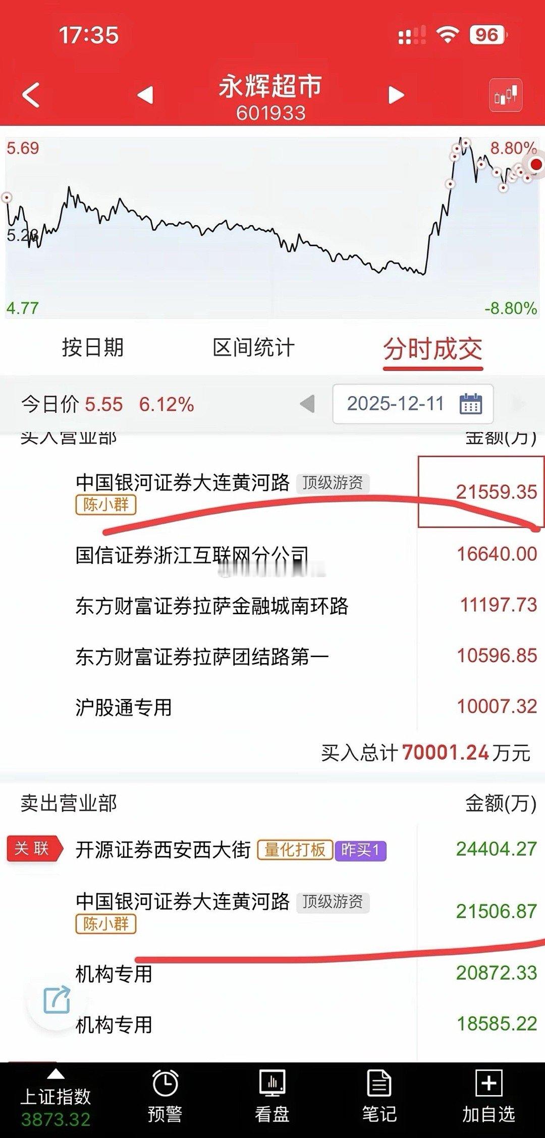 高手从不抱怨,今天大盘调整这么狠,4000家下跌,而永辉却从水下捞上来,结果陈小群却做了个T,依然没有走,早上卖了2.1亿,尾盘又高位买进3.15亿,按道理应该是这波消费没走完,看看明天又是不是有奇迹发生!