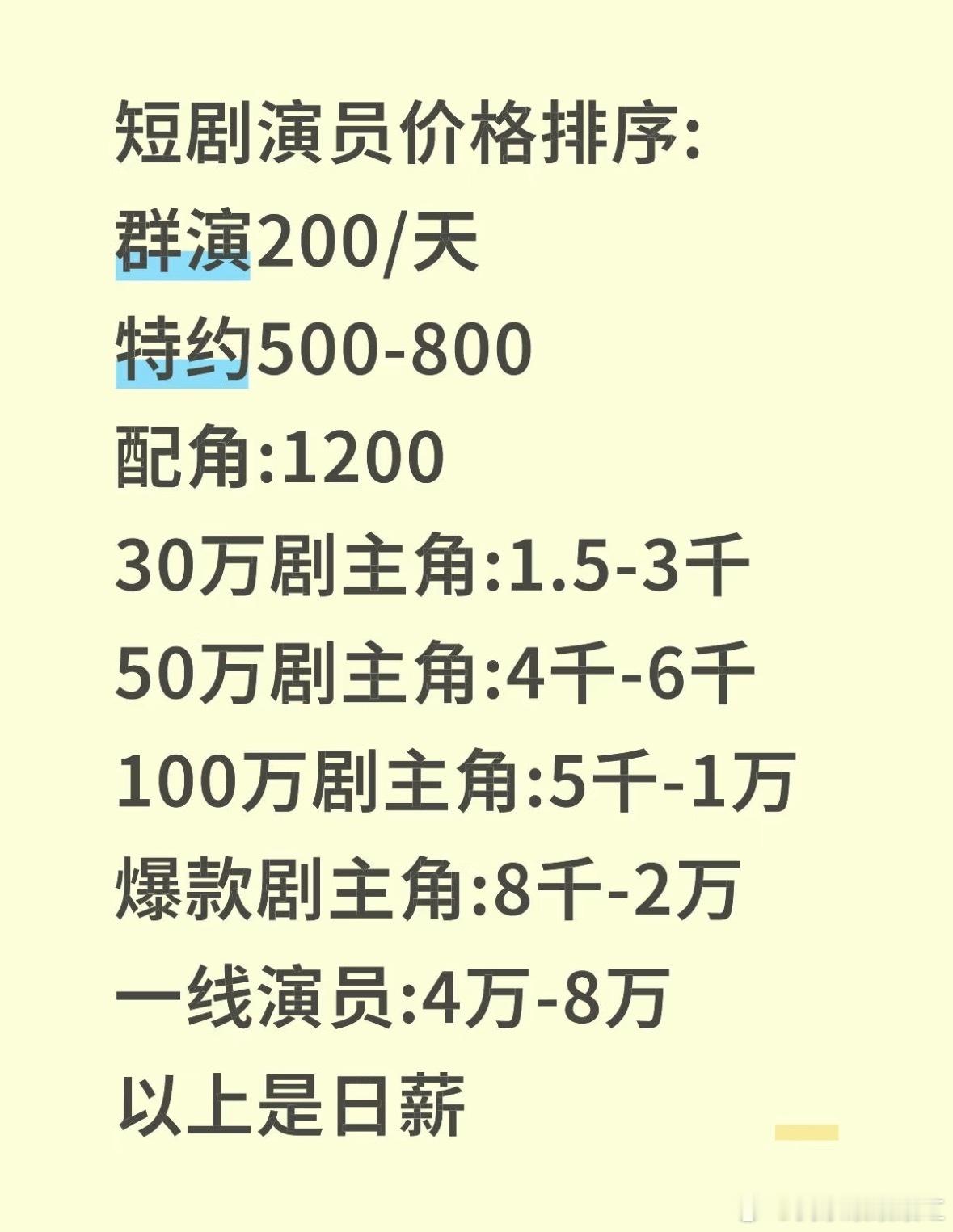 曝短剧演员收入短剧演员的收入差距其实也很大,任何行业都是二八分的头部演员日薪3万