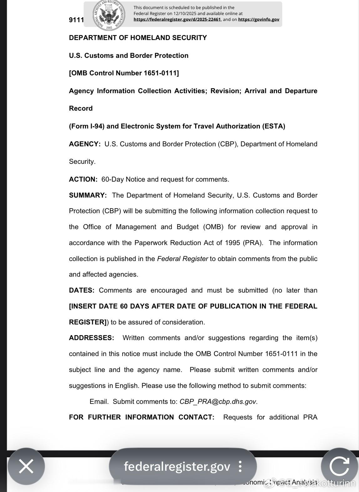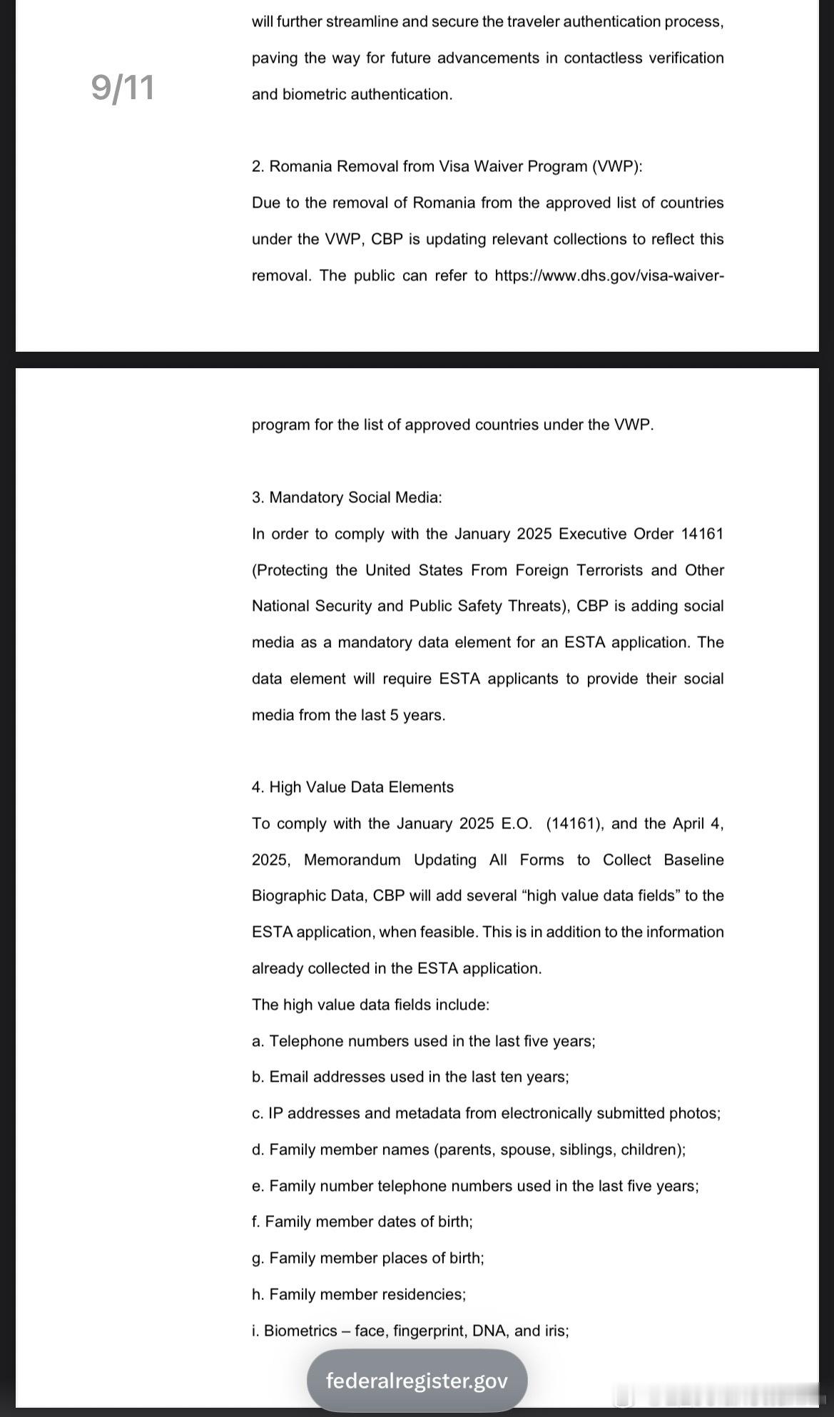 美国要看免签游客过去5年社媒记录不只是社媒纪录哦。作为符合 ESTA 资格的游客(即无需签证的游客,例如来自欧盟、英国、澳大利亚、日本和其他免签国家的游客),他们去美国未来可能还需要提供:- 所有生物识别信息:面部、指纹、DNA 和虹膜- 过去 5 年的所有电话号码- 过去 10 年的所有电子邮件地址- 全家人的信息….DNA我以为是假消息去美国国土安全局网站上查了一下,还真有。虽然还未正式实施,但听上去也够离谱了