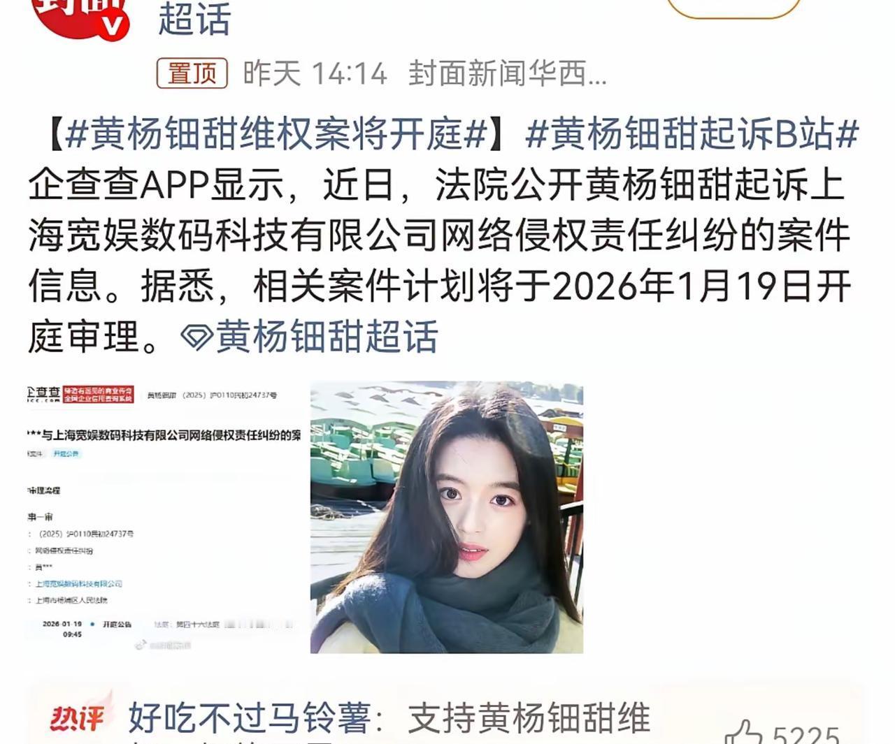 黄杨钿甜起诉B站,是维权还是新剧预热的“阳谋”? 这波操作藏着娱乐圈最扎心的流量真相 新剧开播倒计时,她的团队刚刷完一轮宣传,转头就把B站告上法庭——侵权实锤在手? 还是热度缺口需要“补位”? 半年前天价耳环的谣言余波未平,这次诉讼又把“特权”“炒作”的标签钉死。 你是不是也想说:“想看她演好戏,不想看她炒话题? ” 业内人透露:诉讼带的话题量,顶得上3条热搜曝光——但每一次争议,都在啃食观众对“演员凭作品立足”的信任 不是靠争议刷脸,而是靠角色扎根;流量易逝,作品长存。 演员的终极考场,从来不是热搜榜,而是观众的记忆库