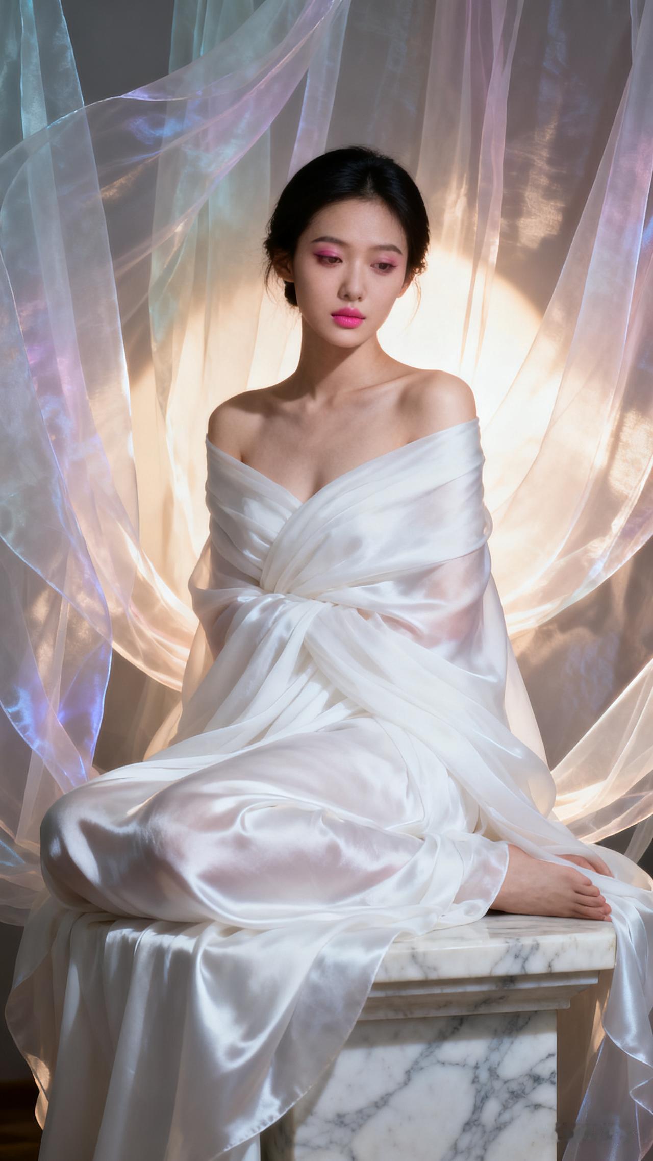 亚洲年轻女子,精致五官配白皙丝滑肌肤,裹白色飘逸长袍端坐大理石基座,衬优雅身姿。