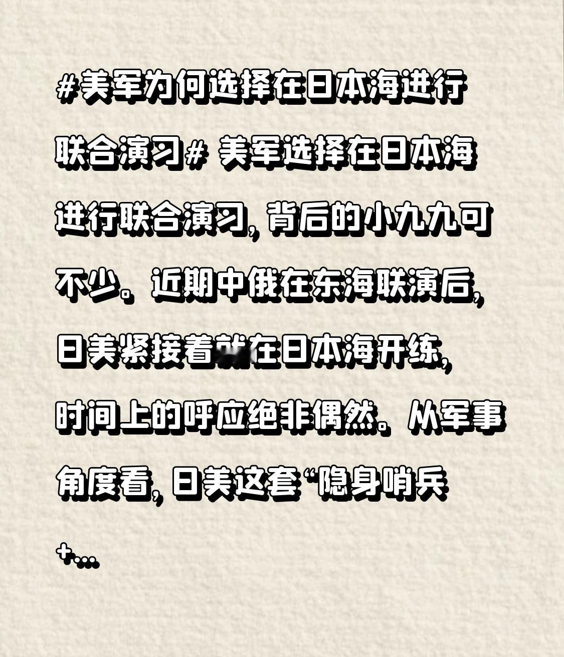 美军选择在日本海进行联合演习,背后的小九九可不少。近期中俄在东海联演后,日美紧接着就在日本海开练,时间上的呼应绝非偶然。 从军事角度看,日美这套“隐身哨兵 + 制空卫士 + 远程重锤”组合,完整演练“侦察 - 护航 - 打击”链条,协同作战成熟度可见一斑。专家分析,这是在向周边发“战略威慑信号”,既牵制俄罗斯远东军事部署,又想在朝鲜半岛问题上刷存在感。 有人觉得这能维护区域稳定,但反对声才是主流。跑到别人家门口秀肌肉,还说维护和平,这就像拿把刀在邻居家门口晃悠,荒谬至极。而且这次“翻车现场”也很尴尬,被解放军侦察机全程围观,电子干扰都没用。