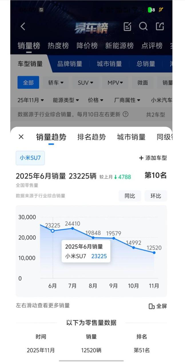 关于小米汽车两款车的销量(也是交付量),有一点让我有点看不懂? 小米yu7在11月份的销量为33729辆,而10月份的销量为33662,几乎持平。 而小米su7在11月份的销量为12520辆,10月份14992辆,少了2472台。 也就是说小米汽车的11月份销量相比10月份少了2400多台。 那么问题来了:小米yu7从6月上市以来已经交付了11万-12万台。距离小米yu7上市3分钟大卖的20万台还有8-9万台没有交付,既然小米su7才能让出来了,小米yu7的产能不是可以得到进一步提升吗?小米yu7在11月份产能怎么还是33000多台呢?下定的小米yu7准车主可是在嗷嗷待哺呢?