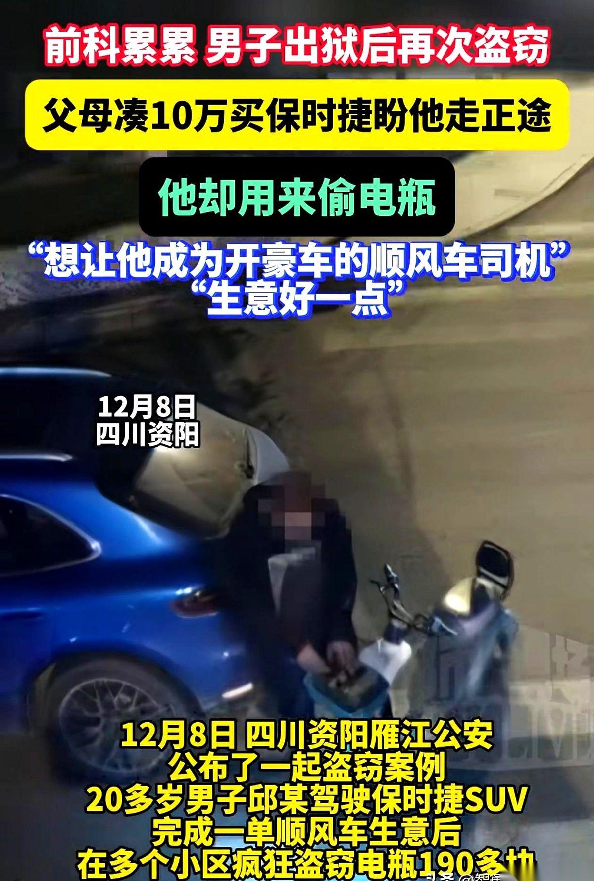 开着保时捷,去偷电瓶。 就这一句话,你是不是已经想笑了?别笑,这是真事儿。 爹妈卖了家里的旧车,凑了十几万,给他买了辆二手保时捷,想让他跑跑网约车,体面点,走上正道。爹妈想的是,儿子不是喜欢豪车吗,这下有面子了,总该好好做人了吧? 结果呢? 他开着这辆爹妈用血汗钱换来的“面子”,一晚上,溜进好几个小区,偷了190块电动车电瓶。 真的,我看到这儿都气笑了。 他缺那点钱吗?开着保时捷的人,会看得上那几块破电瓶? 根本不是钱的事儿。 就是那种骨子里的……手痒。一种改不掉的瘾。 你给他一份体面的工作,他觉得束缚。你给他一辆豪车,他觉得是更方便的作案工具。 你以为你给的是“希望”,在他眼里,那可能只是“装备升级”。 最后你猜谁把他给揪出来的?一个保洁阿姨。 就因为觉得他鬼鬼祟祟的,不像好人。 你看看,多讽刺。 你爹妈用保时捷都换不回你的良心,一个扫地的阿姨,用一双眼睛就给你送进去了。 有些人,你给他一座金山,他可能转头就惦记上隔壁的矿山了。 根儿上烂了,你拿再好的营养液浇,都没用。