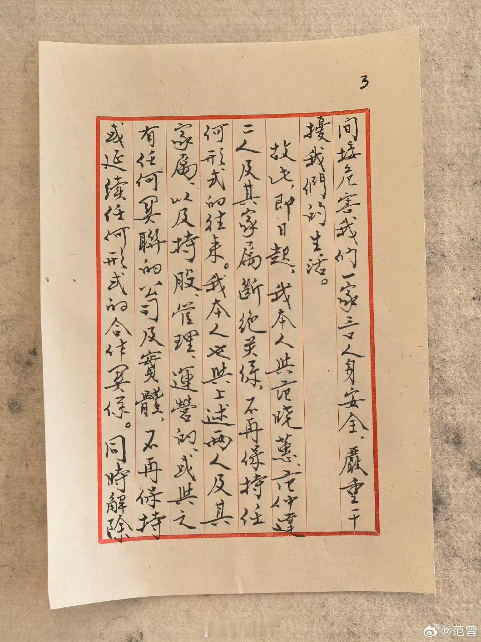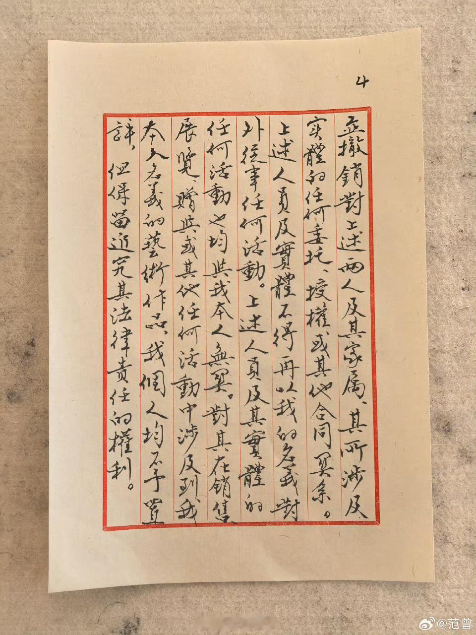 配图用手写稿照片,大概是为了证实声明出自范曾之手。但用这种单方声明来断绝与子女的关系、撤销合作关系和给子女委托授权等关系的法律意义并不大。