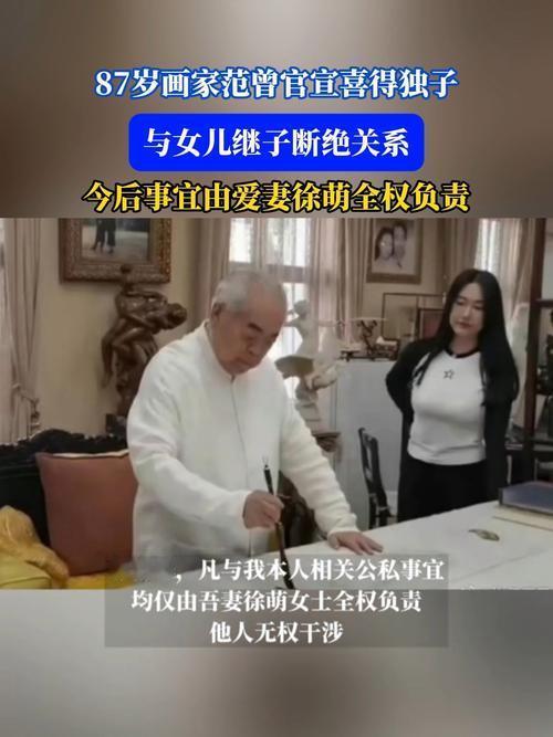87岁画坛巨匠范曾突然宣布喜得贵子!同时声明与女儿范晓蕙、儿子范仲达断绝关系,所有事务全权交由56岁妻子徐萌处理。 女儿范晓蕙回应“无可奉告”,此前她曾发文称父亲被徐萌带走“失联”,赶到住所只见房门贴封条。 网友炸锅:有人调侃“真爱不分年龄”,有人建议“验DNA”,还有人感叹“这才是长寿秘诀”。老艺术家晚年生活比剧本还精彩,这出家庭大戏,你看懂了吗?