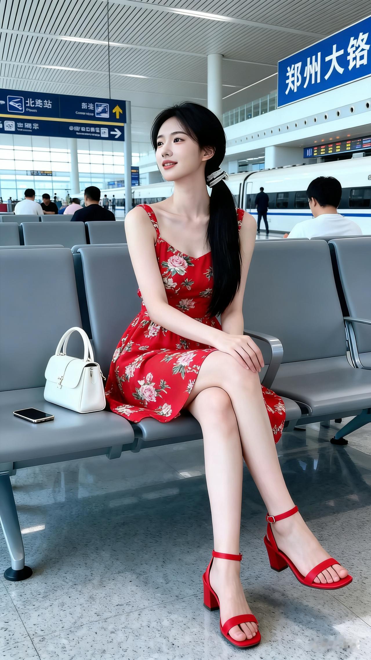 在郑州站,我捕捉到了这位女士的身影,她优雅地坐在长椅上,脚上穿着时尚的高跟鞋,旁边放着一个手提包和手机,清新漂亮。