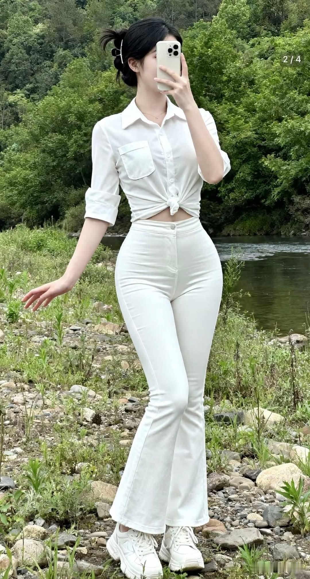 《溪畔素衣》 溪光摇翠绕荒汀,素袂轻裁云色明。 鬓绾青螺簪玉扣,腰萦白练束风轻。 蹲时影落涟漪碎,立处衣沾草露盈。 笑把琼机窥远岫,闲将云鬓惹流莺。 苔痕漫染鞋尖软,林气初薰袖底清。 不是瑶台仙客至,何教山水尽含情。