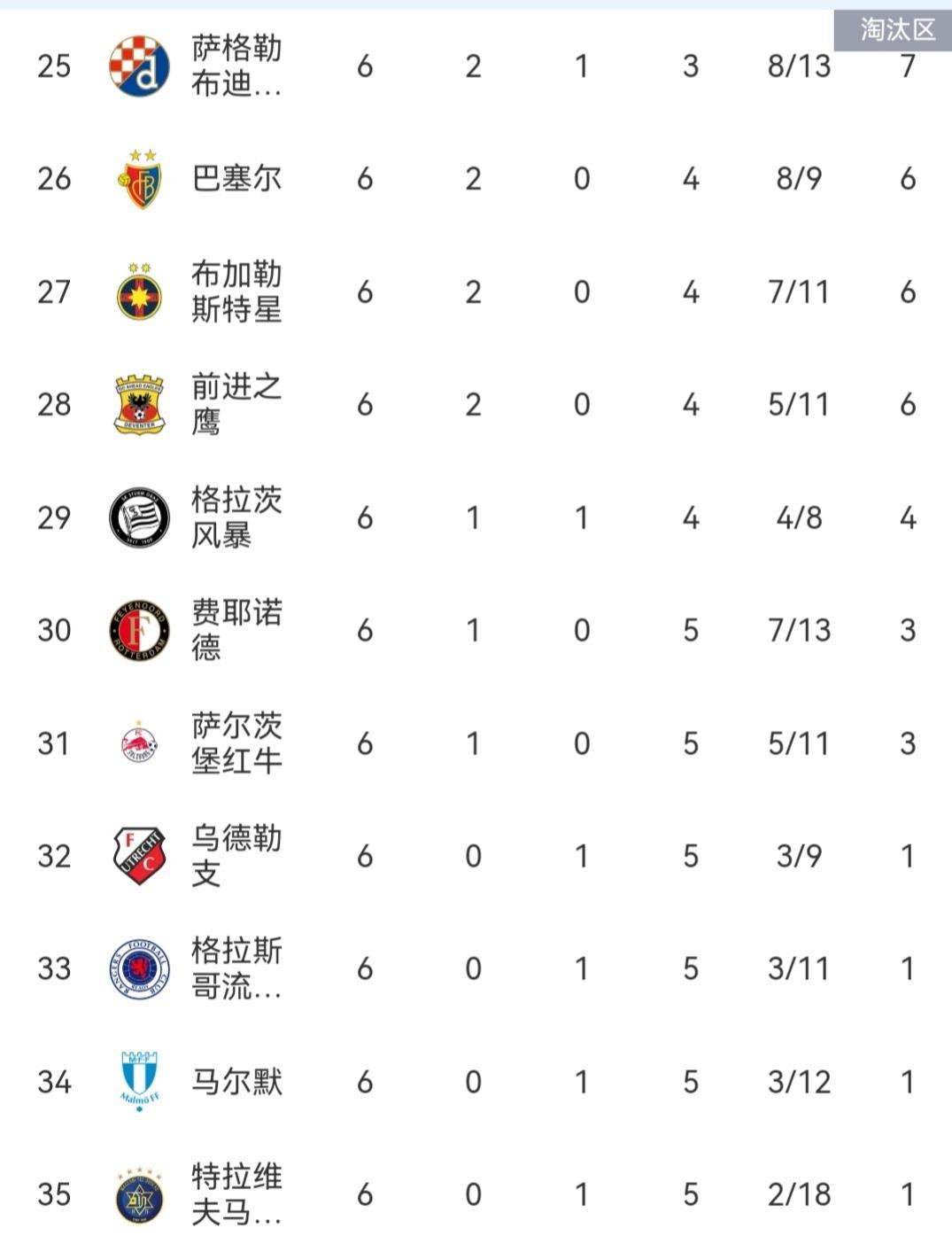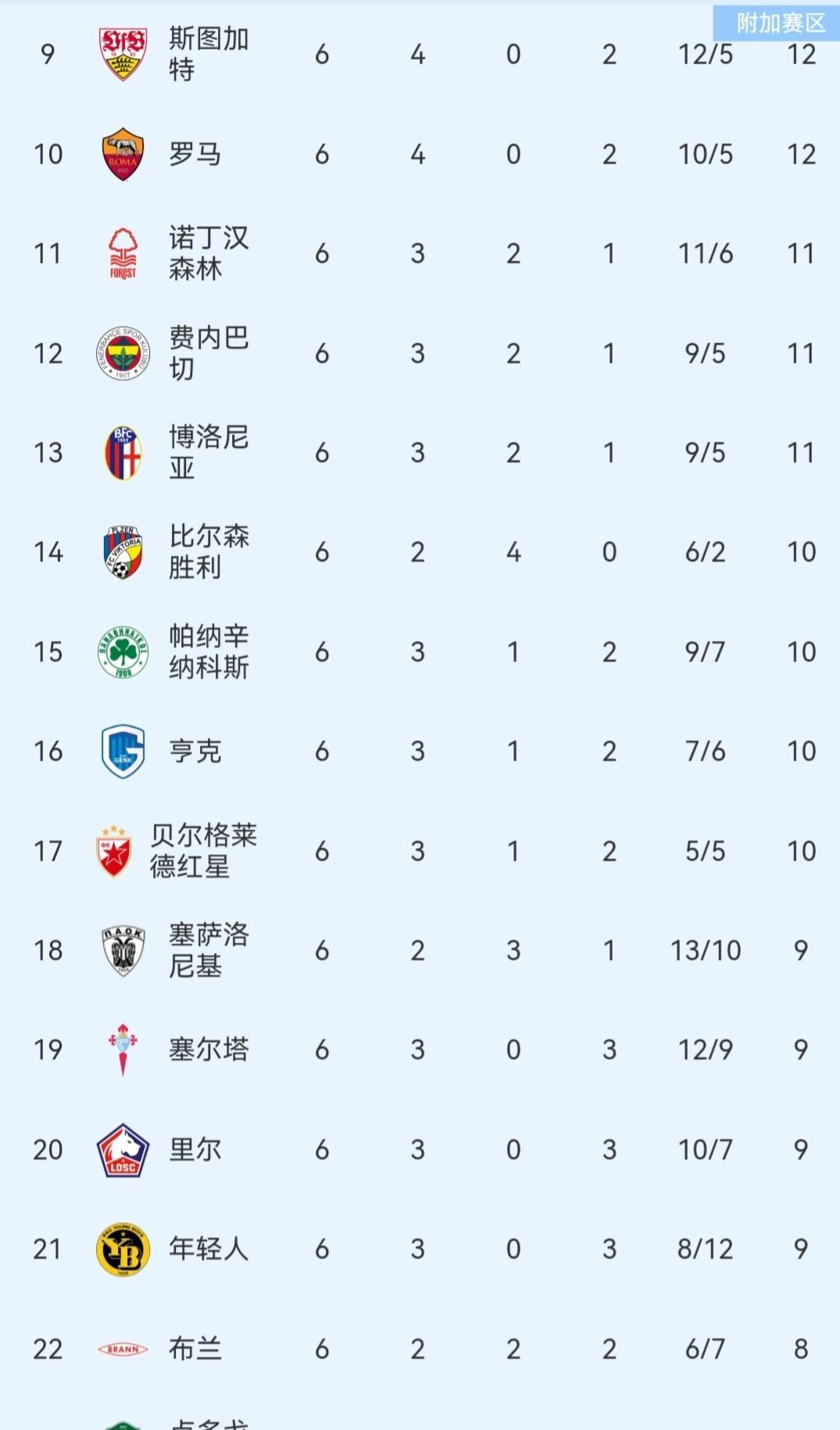 欧联杯第六轮综述 随着罗马3-0凯尔特人、维拉2-1巴塞尔,欧联杯第六轮的比赛全部结束,来看下具体赛果和排名情况! 里昂2-1战胜前进之鹰后和中日德兰、阿斯顿维拉同积15分排名前三,皇家贝蒂斯3-1轻取迪纳摩、弗莱堡1-0力克红牛、费伦茨瓦罗斯2-1战胜流浪者,三队同积14分排名四五六,布拉加第七、波尔图第八! 斯图加特第九、罗马第十、诺丁汉森林第11、费内巴切第12、博洛尼亚第13、里尔第20、费耶诺德客场3-4被布加勒斯特星绝杀排名第30,萨尔茨堡红牛第31! 乌德勒支、格拉格斯流浪者、马尔默、特拉维夫马卡比、尼斯五支球队一胜难求,其中尼斯更是遭遇了欧联杯开赛六连败!