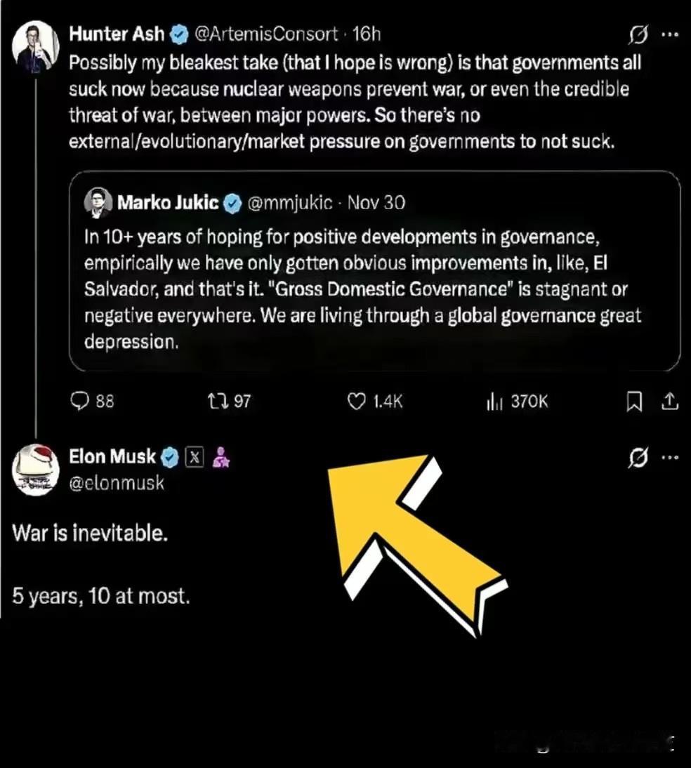 马斯克凌晨3点不睡觉。 他预判:战争或许无法避免 理由很硬,全球性的债务危机,和生育率下降,这两者在历史上都是引发战争的常见理由。俄乌还在打,中东也不太平,印太地区更是暗流涌动。 能让这位科技狂人深夜不寐的,绝不是无稽之谈。马斯克的判断,戳中了当下全球格局最敏感的两根神经——债务是经济的炸弹,低生育率是社会的慢性病,这两样凑在一起,历史上从来都是冲突的温床。1902年委内瑞拉暂停偿还外债,就引来英德意三国直接派舰队封锁港口、炮轰炮台,只为逼着这个南美国家还债,可见债务纠纷能轻易点燃战火。放到现在,全球债务总额早已突破300万亿美元,不少国家拆东墙补西墙,这种紧绷的状态,一旦某个节点断裂,很可能引发连锁反应。 低生育率的隐患更隐蔽,却更致命。人口是生产力的根基,也是社会稳定的压舱石。现在全球多数发达国家生育率跌破更替水平,老龄化浪潮席卷而来。劳动力短缺、社保体系承压,各国为了抢人才、抢资源,竞争只会越来越激烈。当和平手段满足不了需求时,某些国家就容易动起“用拳头说话”的歪心思,毕竟历史上,资源匮乏与人口结构失衡,从来都是扩张主义的借口。 马斯克没说透的是,现在的局势比历史上更复杂。以前的冲突多是局部利益争夺,现在全球化把各国绑在一艘船上,却也让矛盾更难调和。俄乌战场的炮火还没停,中东的硝烟又起,印太地区的军事部署层层加码,这些不是孤立的事件,而是全球秩序重构期的必然摩擦。更值得警惕的是,马斯克之前还警告过,人工智能主导权的争夺可能成为新的战争导火索,当技术竞争、债务压力、人口危机三重叠加,冲突的风险只会指数级上升 。 那些觉得马斯克是“危言耸听”的人,多半是被和平年代的惯性麻痹了。和平从不是历史的常态,而是需要各方合力守护的脆弱平衡。现在有些国家一边大肆举债搞军备竞赛,一边对低生育率问题束手无策,却还在到处挑动对立、制造分裂,这无疑是在给战争的火种添柴。 马斯克的预判,更像是一记警钟。债务可以通过协商化解,生育率可以通过政策引导改善,这些都不是无解的死局。真正可怕的是傲慢与短视,是把战争当成解决问题的选项。全球各国早已你中有我、我中有你,真打起来没有赢家,只会是全人类的灾难。 凌晨3点的马斯克,或许是在为人类的未来焦虑。他的话不是预言,而是提醒——如果不想让战争的阴影笼罩,各国就该放下对立,共同应对眼前的危机。毕竟,合作共赢才是唯一的出路。 各位读者你们怎么看?欢迎在评论区讨论。