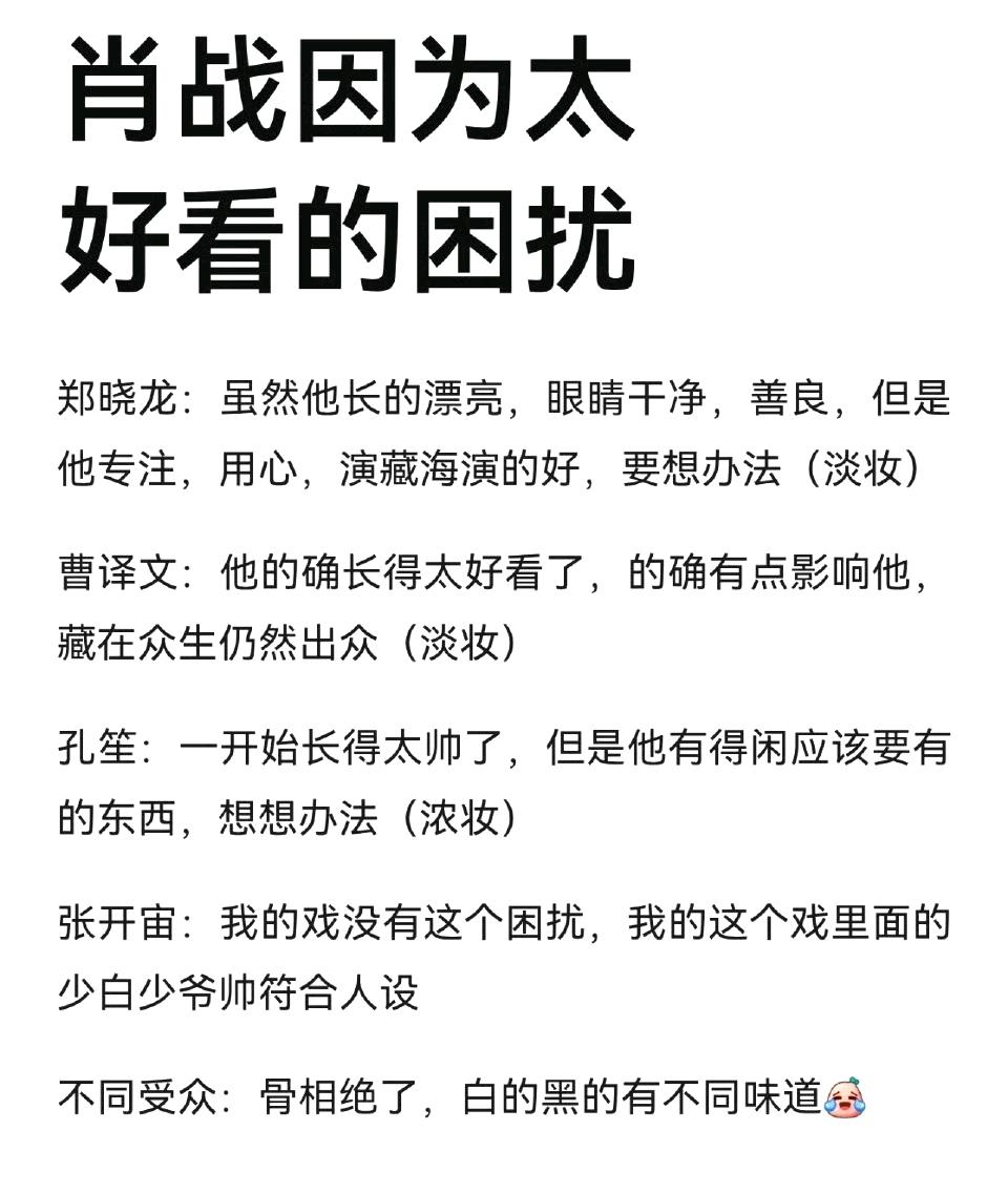 我发现了个有意思的事儿 提起肖战 每个导演都在公开场合声明不是看中肖战的脸才选他的。但是又不否认肖战的颜值确实很高。 他又好看演技又好,各位影视剧主创宁可想办法降低肖战颜值也要肖战来演自己的作品。 合理怀疑要不是因为长得太好太过光芒万丈,肖战早几年就已经是“老戏骨”了。 别人吃美貌的红利,肖战一直在吃美貌的黑利[捂脸]