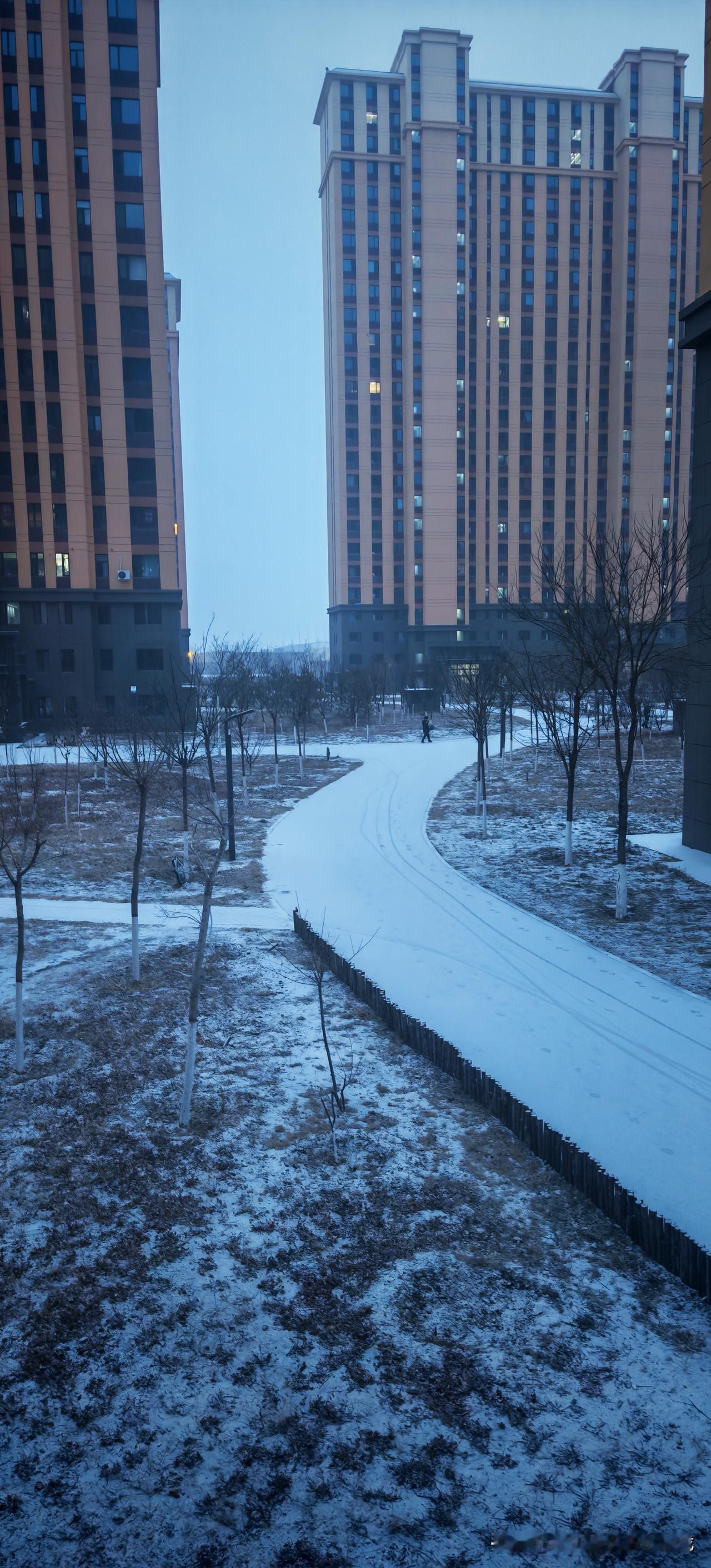 清晨的雪,揉碎了冬日的沉闷 今早一把拉开窗帘,瞬间就被窗外的雪景勾住了目光。 小区里的步道被白雪裹得严严实实,弯弯曲曲的雪径上留着几道浅浅的脚印,像是谁早起踩出的温柔印记。两旁的高楼立在晨雾里,暖黄色的楼体和冷白色的雪相映着,倒少了些冬日的凛冽,多了点软糯的温柔。光秃秃的树枝上挂着薄雪,风一吹,细碎的雪沫子轻轻飘下来,落在枯黄的草叶上,给蔫巴巴的草地缀上了银边。 本来早起还带着点赖床的慵懒,看到这雪,心里一下子就亮堂了。想着等下下楼踩踩雪,听脚下咯吱咯吱的声响,再买个热乎的豆浆油条,平凡的冬日清晨,就被这一场雪揉得软乎乎的。生活的美好,大抵就是这样不期而遇的小惊喜吧。