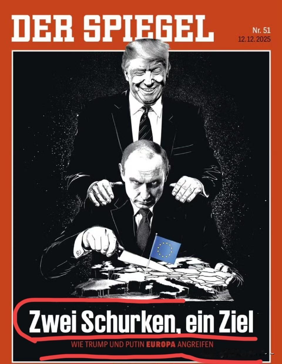 外网传疯了?外网传疯了! 欧洲坐不住了?![捂脸] “明镜周刊”最新封面挺唬人的,有人看得懂吗?应该是表达了欧洲对特朗普和普京的不满吧? 为什么不满呢? 在我看来,一方面是美国的新版国家安全战略根本没有把欧洲放在眼里,而且还有羞辱的意思! 另一方面俄罗斯和美国在俄乌谈判的立场上是大体相同的,然而也没有把欧洲放在眼里面。 所以,这个德国媒体“明镜周刊”是认为目前俄罗斯和美国在攻击欧洲。[捂脸] 注意:本图要细看。[赞]