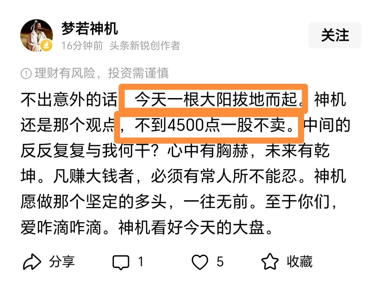 神机神人!梦若神机被封之后,感觉整个人更加激进了,在股市连续回调的时候,竟然发文“一根大阳线拔地而起”,甚至预测股市能看到4500点,和原来的梦若神机完全不一样了。梦若神机胆子越来越大,说的越来越玄,离市场也越来越远了!