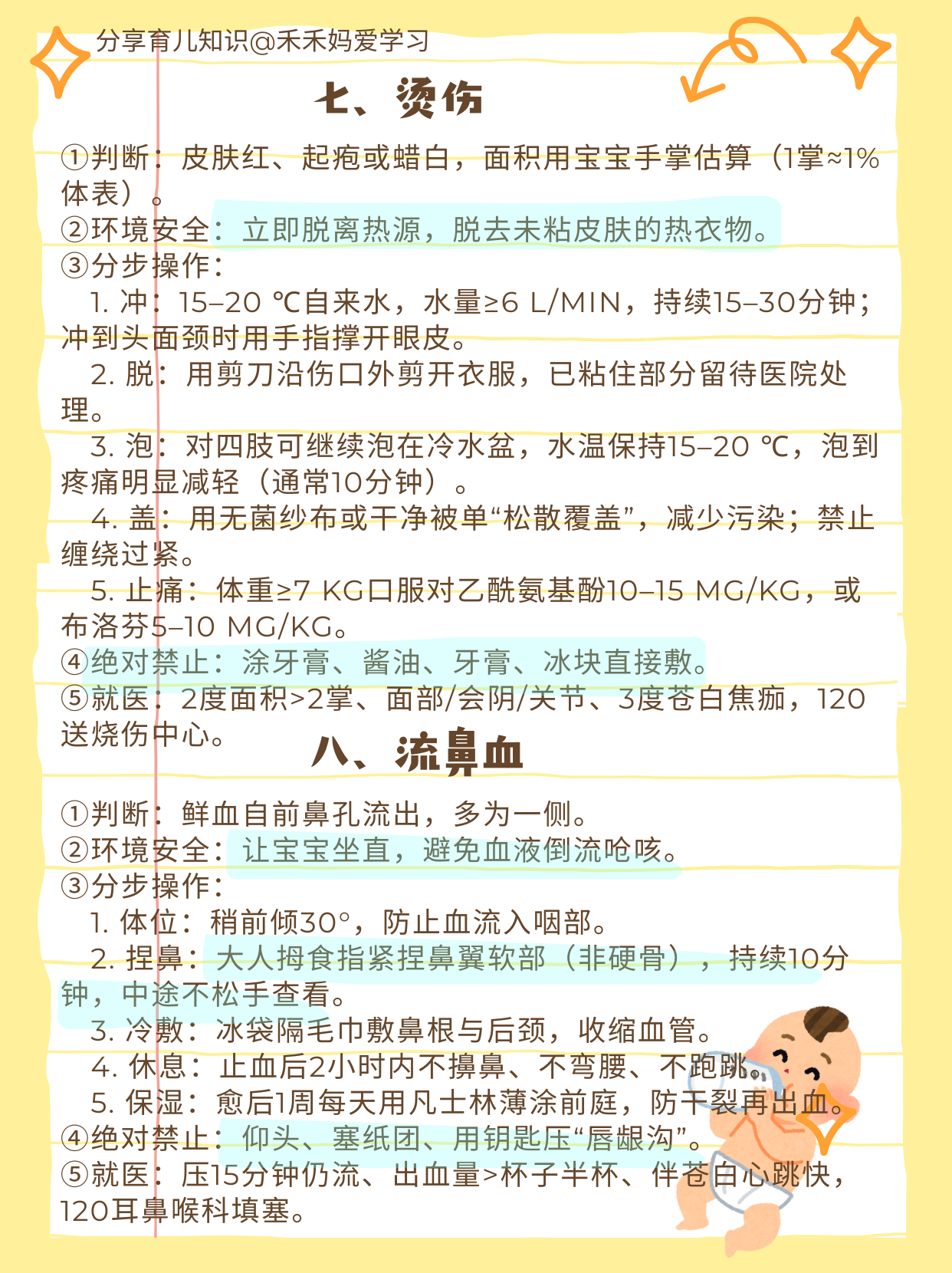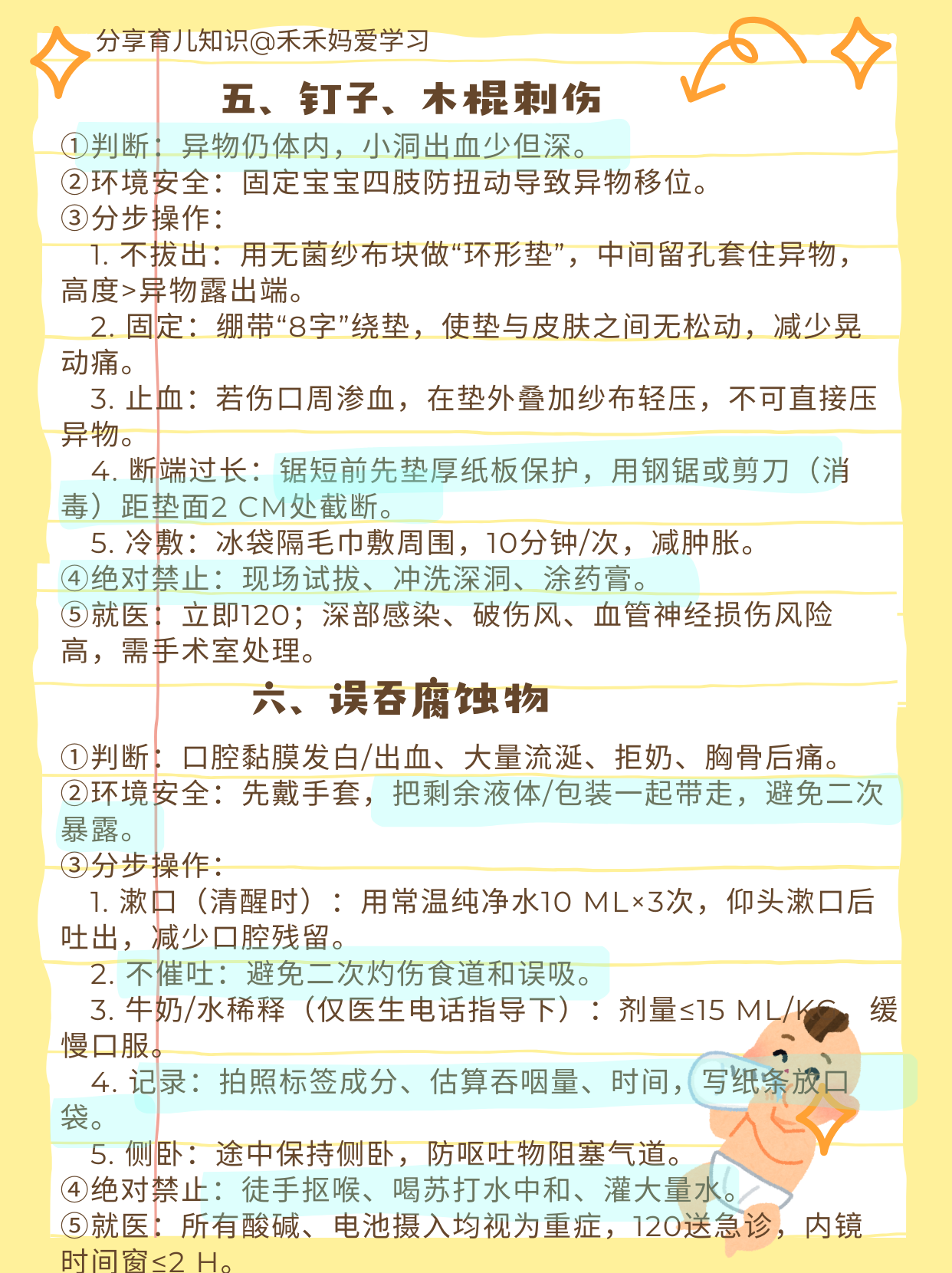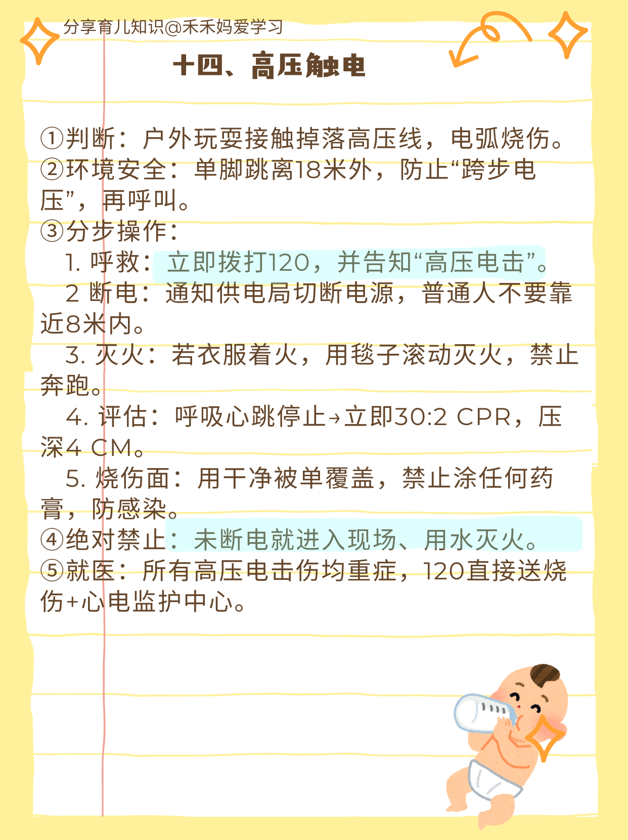 对于绝大多数父母而言,孩子的生命安全要远比自己重要,但是作为新手父母,孩子年龄小不懂事,会爬就摔、见啥吃啥、见水就栽,爸妈 24 小时贴身也防不住。 这时候,学习一些急救知识就显得极为重要。 很多时候,在紧急情况下,处理得当和处理不当,对孩子来说就会开启完全不同的两种人生。 比如孩子气管细且嫩,吃鱼就很容易被卡,一旦被卡,处理不及时就可能丢去性命,让一个家庭陷入灭顶之灾。 而如果掌握了“海姆立克急救法”,则能帮孩子把异物拍出来,让他脱离险情。 禾妈把14种常见婴幼儿意外伤害,按“黄金5分钟”能读完、能照做的标准,写成“一步不落”的图文式操作卡片。 格式统一:①判断→②环境安全→③分步操作(带手法、时长、力度、口诀)→④绝对禁止→⑤何时拨打120。 建议每一位新手父母都认真看一看学一学并牢记在心,最好收藏起来,有条件也可以打印成A4,每页正反2个场景,塑封后贴在客厅、卧室、车里各一份,以备不时之需。