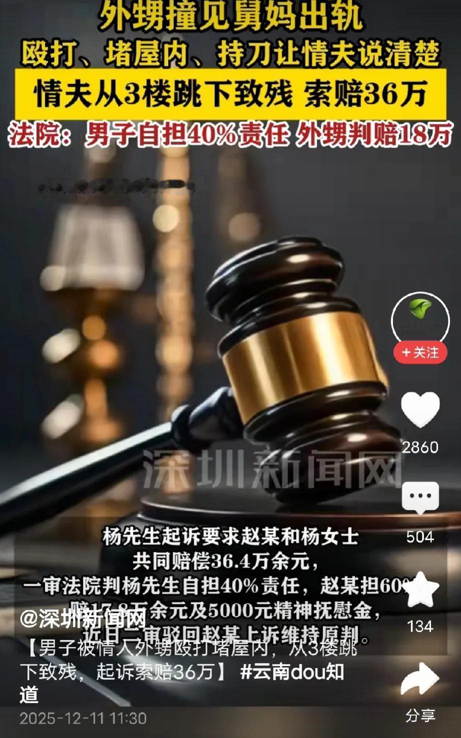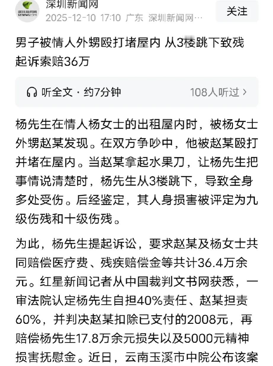 云南玉溪,36岁男子爱上43岁已婚女子,两人在租房喝酒、聊暧昧,女子外甥突然到访,外甥怀疑舅妈背叛了舅舅,气从中来,揪住男子就问他和舅妈什么关系?让他说清楚,男子吓得直哆嗦,外甥越看越气,对他进行殴打,4次堵门不让他走,甚至拿水果刀逼问他。男子一慌,直接从3楼窗户跳下,最终全身多处受伤,造成9级伤残和10级伤残。事后,男子把女子和外甥告上法庭,索赔36万,法院判了。 2024年杨先生和杨女士在打工期间认识,杨先生36岁,杨女士43岁,虽然两人相差7岁,但是杨女士看起来显年轻,是杨先生喜欢的类型。 认识一段时间后,两人越走越近,最终发展成情人关系,虽然两人都是已婚人士,但是禁不住彼此的诱惑,他们还是背叛了家庭,经常偷偷私会。 杨女士在外租了一间房子,杨先生经常到杨女士的租房跟她幽会。 2024年10月22日下午6点左右,杨先生买了酒、菜,到杨女士租房做饭。 饭菜做好后,两人边吃边聊,俨然一对恩爱的小夫妻。 就在两人吃饱喝足,聊些暧昧话语的时候,杨女士突然听到有人敲门。 杨女士起身开门发现,门口站着她老公的外甥赵某。 杨女士看到赵某脸色立刻就变了,此时,赵某也看见了杨先生。 当时是晚上9点多,这大晚上的,舅妈和一个陌生男子共处一室,孤男寡女的,赵某立刻就对他们起了疑心。 他当即上前逼问杨先生跟他的舅妈两人是什么关系? 杨先生一看到高大魁梧的赵某,心里瞬间打怵,别说跟他打起来了,哪怕他压着都能把自己压扁。 害怕的杨先生只能闭口不说话,生怕自己说错了,惹怒赵某。 赵某越看杨先生一副做错事,害怕的唯唯诺诺的样子,对他们的疑心越重,心里就越生气。 敢偷他舅舅的女人,绝不轻饶,多次逼问无果后,赵某直接展开殴打,杨先生怕了,多次想从门口逃出,但是赵某哪里肯放过他。 连续4次出逃无果后,杨先生心里更加害怕,赵某心里越想越气,从桌上拿来水果刀逼问他,一定要让他讲清楚他跟舅妈的关系。 杨女士见状也吓坏了,期间多次上前拉扯赵某,叫他别冲动,也别打人,但是赵某听不进去。 杨先生越看赵某越感到害怕,自己116斤的身材,哪里抵得过两百多斤的小伙,让他再这么折腾下去,自己不挨一身伤也掉一层皮。 所以,情急之下,杨先生纵身一跃,直接从3楼窗户往下跳。 杨先生这一举动,直接让杨女士和赵某吓傻了,他们没想到,杨先生会来这么一出,等两人反应过来,只听到“砰”的一声,接着杨先生连连叫苦。 赵某和杨女士赶紧冲下楼,他们来到楼下,只看到,杨先生躺在那动弹不得,脸色发青,表情痛苦。 赵某赶紧拨打110报警电话和120急救电话。 杨先生先是被送往通海县医院看门诊,当时花费867.92元,后来因为伤势过重当天又转去玉溪市医院住院。 杨先生在医院里整整住了40天,门诊和住院医疗费一共花去8万多,另外期间还请了护工,花了不少护理费、还有担架费等各项费用。 杨先生被诊断出脑水肿、多处骨折等伤情,鉴定后构成九级加十级伤残,鉴定费花去1800元。但,赵某只给过他2008元现金。 出院后,杨先生越想越觉冤,把赵某和杨女士告上法庭,向他们索赔36万元。 法院经过审理认为,赵某的暴力威胁是主因,需要承担60%责任。 但杨先生自身也有过错(和他人处情人关系、未理性自救反而跳楼),自担40%责任,杨女士因未实施侵害且劝阻赵某,无需担责。 法院核定杨先生总损失约30.04万元,另支持5000元精神损害抚慰金,赵某需赔偿18.02万余元(扣掉已付的2008元,实际赔17.8万余元)及5千元精神抚慰金。 赵某不服提起上诉,今年7月21日,中院二审判决,维持了原判。 从情理角度看,这起事件里没有真正的赢家。 杨先生明知双方均已婚,仍与杨女士发展情人关系,违背公序良俗,是矛盾的源头。 赵某出于维护舅舅的立场心生愤怒可以理解,但他选择殴打、持刀威胁的极端方式处理问题,不仅违法,还直接导致杨先生跳楼致残,行为明显过激。 杨先生在遭遇威胁时,未选择报警等理性自救方式,而是冲动跳楼,也为自身伤情埋下了隐患。 杨女士虽未直接施暴,但她的婚外情是导火索,且未能有效制止冲突升级,也难辞其咎。 那么,这件事从法律角度如何看待呢? 根据《民法典》第1165条规定,行为人因过错侵害他人民事权益造成损害的,应当承担侵权责任。 依照法律规定推定行为人有过错,其不能证明自己没有过错的,应当承担侵权责任。 本案中,赵某实施殴打、持刀威胁、堵门等行为,存在明显过错,其行为与杨先生跳楼致残的损害结果有直接因果关系,符合该条款中过错侵权的构成要件。 所以,法院判决他承担60%的侵权赔偿责任;杨先生自身存在过错,因此自担40%责任,符合过失相抵的法律原则。 借这个事件提醒大家,婚外情碰不得,害人害己!另外,遇事别冲动暴力,也别瞎选逃生路,不然吃亏的是自己。