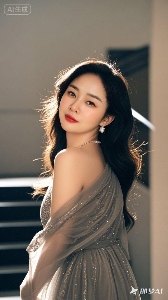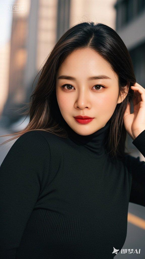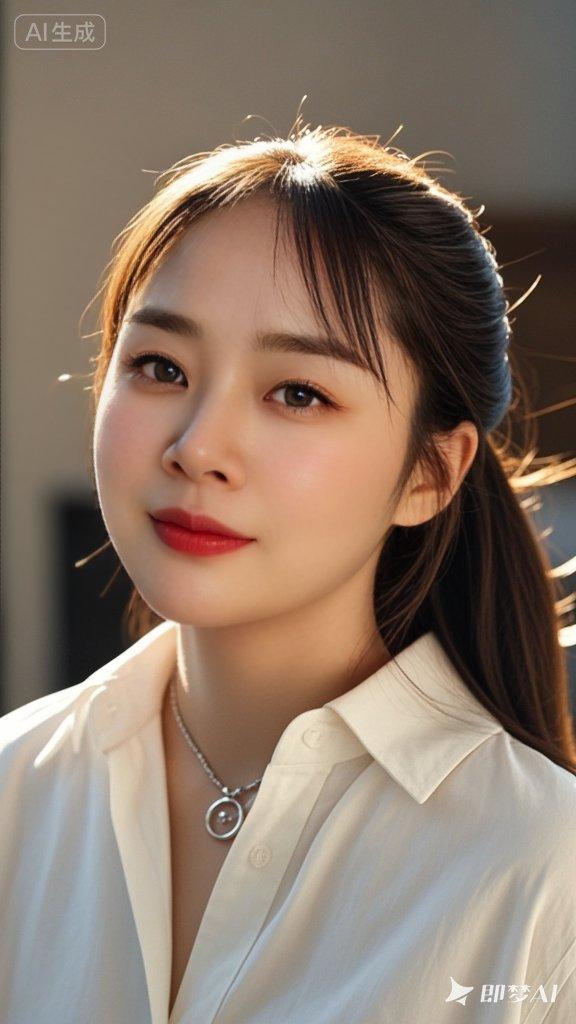 一位年轻的中国美女,鹅蛋脸,精致的五官,大眼睛,化着温柔的纯欲妆容,唇色是浅豆沙