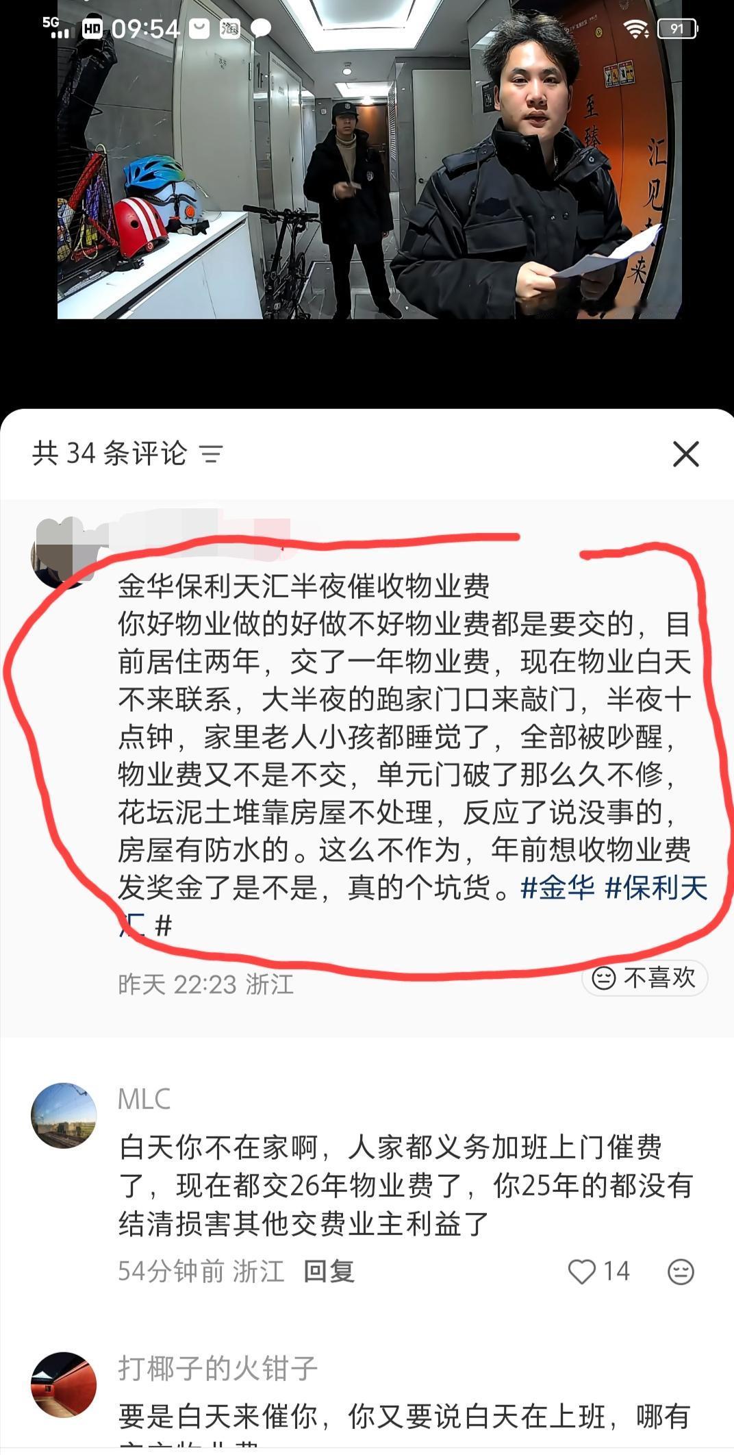 浙江金华,网友发视频吐槽:大半夜上门收物业费,“保利天汇”我也是服了你了,家里老人小孩都睡着了,全部被吵醒了…… 据这位网友表示:自己入住了两年了,交了一年物业费。物业白天不联系,半夜十点直接上来敲门。自己物业费又不是不交! 评论区网友还是给予物业工作人员足够的体谅:白天大家都上班,只能晚上上门催收了。如果物业大差不差,该交还得交。大家都交了,凭什么你要搞特殊呢?人家是上门收你25年拖欠的那部分,又不是提早收你26年的物业费。 就“物业和业主”的这个话题,大家是什么想法?