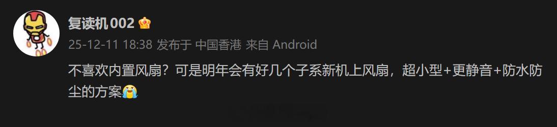 夏天玩手机,手机温度都能达到50°,内置风扇还是有必要的。但是,添加风扇肯定是需要牺牲一部分的内部空间的,增加电池的功耗,不要为了内置风扇去砍电池,不然续航就是很大问题