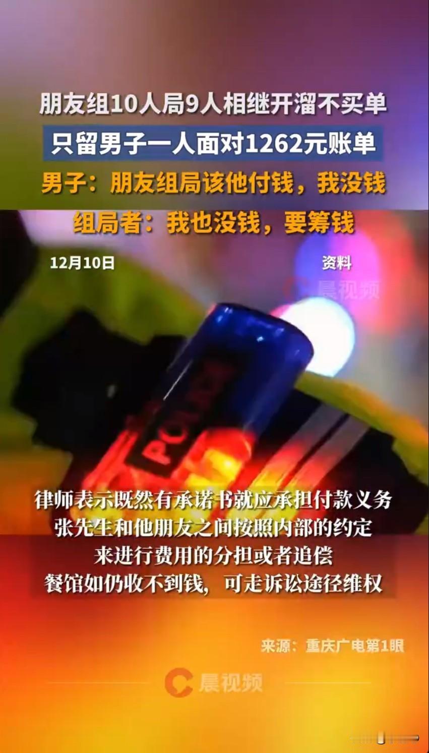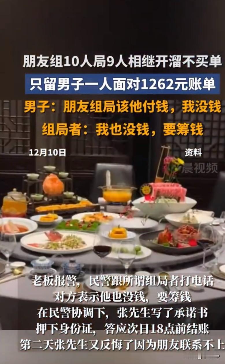 重庆九龙坡一家餐馆里,上演了一出让人跌破眼镜的“聚餐逃单大戏”,10个人热热闹闹凑局吃饭,最后竟留下一个人面对千元账单,这事传开后网友都直呼“活久见”。 那天傍晚,张先生跟着朋友“小银”去赴约,一行10人说说笑笑走进餐馆包间,看着都是称兄道弟的熟人。从傍晚一直吃到深夜,桌上的十几盘菜吃得见底,三箱啤酒也喝得干干净净,全程划拳碰杯、聊得热火朝天,谁看了都觉得是关系铁的哥们聚会。可没人想到,这热闹背后早就藏好了算计,散场前有人陆续找借口溜号,要么说“家里有事得先走”,要么喊着“明天要早起”,剩下的人还假惺惺挽留,转头自己也悄悄从后门溜了,从头到尾没一个人提买单的事。 等服务员推门进包间,当场就懵了,偌大的包间里只剩张先生孤零零坐着,其他9个人早就没了踪影。随后服务员拿着1262元的账单走过来,张先生一看直接傻眼了,赶紧掏出手机联系组局的“小银”,结果微信发出去全是红色感叹号,电话好不容易打通,对方只含糊说“身上就200块,得凑凑”,没等多说就挂了机,再打直接关机失联。他又挨个联系其他同伴,不是不接电话就是被拉黑,之前热闹的聚餐群也瞬间安静得像没人存在过。 餐馆老板开店好几年,头回见这操作,自然不肯让张先生走,双方吵得脸红脖子粗,邻桌客人看不下去,劝着报了警。民警到场后了解情况,查了组局者“小银”的信息,发现他居然还有两次逃单前科,之前也试过喊一群人吃饭然后自己溜之大吉。调解到凌晨,张先生实在没办法,只能签了付款承诺书,把身份证押在餐馆,承诺第二天结清1262元餐费,老板这才放他走。 可谁料到第二天老板催款时,张先生直接变卦了,说自己问了懂法律的表哥,没说好谁付钱就不该他全出,还说老板扣身份证违法。这下老板也气炸了,拿出承诺书说理,双方又吵了一架。其实从法律上来说,张先生签了承诺书就有付款义务,要是一直拖着不付,老板拿着承诺书去法院起诉,大概率能胜诉。而且这10人一起消费,商家本来就有权向任何一个参与者要全款,总不能让店家白白吃亏。 更让张先生委屈的是,他自己就吃了几口青菜、喝了两瓶啤酒,现在却要扛下全部费用。他私聊其中一个熟人,对方还说“以为是小银请客,他之前总说自己付才去的”,说完就拉黑了他。网友们看了这事都议论纷纷,有人骂逃单的9个人没诚信,人品烂到骨子里,也有人替张先生喊冤,说这是“1262块看清10个人”,妥妥的现实版“塑料友情”。 现在不少人聚餐都学精了,提前就问清楚“AA还是请客”,没说清楚再熟也不轻易赴约。毕竟谁也不想当那个被账单钉住的冤种,一顿饭钱事小,丢了诚信和情谊才真的得不偿失,成年人的相处,最基本的就是靠谱和担当啊。饭店逃单 餐饮店逃单 来源:潇湘晨报