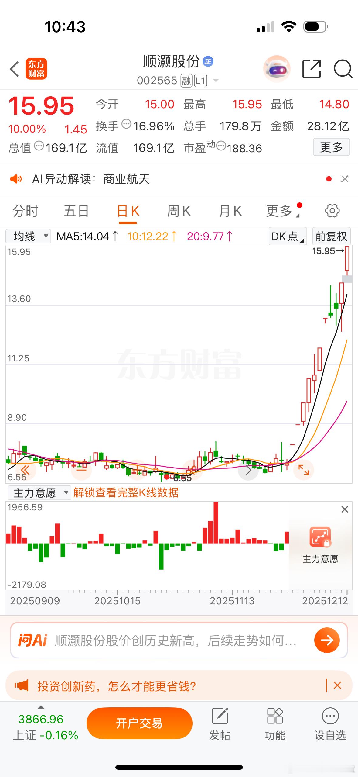 航天高潮中,航天机电,航天动力都快板了,而且30CM还有连板,不过今天AI 赛维电子也确实不错。昨天是超预期杀跌今天是超预期上涨,监管股的魅力吧,当然航天这儿确实还是没有监管股再说吧,至少今天顺灏股份目前没骗人,前四天天天集合高开回落,今天没骗人就行。