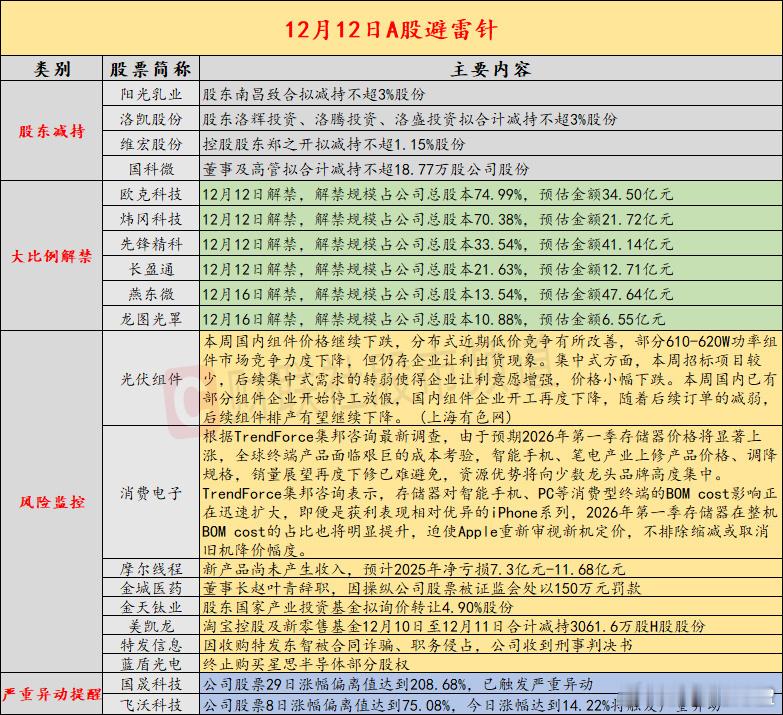 【12月12日投资避雷针:摩尔线程提示风险 预计2025年净亏损7.3亿元-11.68亿元】近日,A股及海外市场潜在风险事件如下。国内经济信息方面包括:1)国内商品期市夜盘收盘多数下跌,能源品跌幅居前;2)本周国内组件价格继续下跌,后续排产或继续下降;公司方面重点关注包括:1)摩尔线程提示风险,新产品尚未产生收入,预计2025年净亏损7.3亿元-11.68亿元;2)金城医药董事长赵叶青辞职,因操纵公司股票被证监会处以150万元罚款;海外市场重点关注包括:1)美股三大指数收盘涨跌不一,大型科技股多数下跌;2)欧盟拟推迟燃油新车禁售令五年。