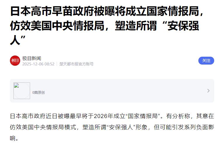 12月9日,日本再次释放危险信号! 这事儿真是越看越不对劲,12月9日,日本高市早苗政府刚证实要设个部长级的情报监督大臣。 说是为了应对复杂安全环境,其实明眼人都能看出来,这就是在突破和平宪法的底线,往军事扩张的路上猛跑。 二战结束后日本定的和平宪法,本来就明确说了不能搞侵略性的情报活动,以前日本的情报工作大多分散在各个部门。 比如内阁情报调查室、防卫省情报本部这些,各管一摊,就算合作也有限制,就是怕权力集中了又走回军国主义的老路。 可现在高市早苗政府非要搞这么个新职位,把所有情报工作都集中起来,直接对首相官邸负责,这不就是要打造日本版的中情局嘛。 他们嘴上说什么安全环境复杂,其实就是找个借口。这些年日本一直在渲染所谓的 “中国威胁论”。 新版防卫白皮书草案里还把中国当成 “最大战略挑战”,硬说东亚可能出现俄乌冲突那样的局势。 说白了就是为增加防卫预算、扩张军力找由头。现在设立这个情报大臣,就是要把情报工作变成军事行动的 “眼睛”。 以后不管是海外派兵还是搞所谓的 “主动威慑”,都能有精准情报支撑,这哪里还是 “专守防卫”,分明是要主动挑事。 更让人警惕的是,这不是日本第一次搞小动作了。之前他们就不断增加防卫预算,要涨到 GDP 的 2%。 还放宽武器出口限制,甚至有高官说不排除引进核动力潜艇,对 “无核三原则” 也含糊其辞。 现在又搞情报集权,这些动作串起来看,就是一步步撕毁和平宪法的束缚,要从 “和平国家” 变回 “能战之国”。 要知道,二战时日本军国主义就是靠着强大的情报网络配合军事行动,给亚洲各国带来了多大的灾难,现在他们又来这一套,周边国家能不担心吗? 高市早苗本来就是出了名的鹰派,上台后一门心思搞安保扩张,这次设情报大臣,一方面是想讨好国内右翼势力,树立自己 “安保强人” 的形象。 另一方面也是跟着美国的步调走,要在亚太地区搞对抗。 可他们忘了,和平宪法是日本战后立足的根本,也是亚洲邻国信任他们的基础。 现在公然违反宪法精神,把情报工作变成军事扩张的工具,这种做法只会让亚洲国家重新想起当年的战争创伤,彻底失去对日本的信任。 中国外交部早就说了,对日方的军事安全动向感到严重关切,毕竟日本这些操作已经严重影响到地区安全稳定。 以前日本的情报工作大多侧重经济领域,现在完全转向了军事和对外对抗,这种转变太危险了。 这个新的情报大臣职位一旦设立,日本的情报搜集能力会大大增强,而且权力集中在少数人手里,很可能会催生更多冒险的军事行动。 说白了,日本这是在走危险的回头路,所谓的 “应对安全环境” 不过是个幌子,真实目的就是突破和平宪法限制,强化军事扩张的能力。 作为曾经遭受过日本侵略的国家,我们必须保持高度警惕,不能让历史悲剧重演。 日本这种无视历史、挑战和平底线的做法,不仅会遭到周边国家的反对。 最终也会让自己陷入孤立,毕竟和平发展才是人心所向,搞军事扩张注定没有好下场。