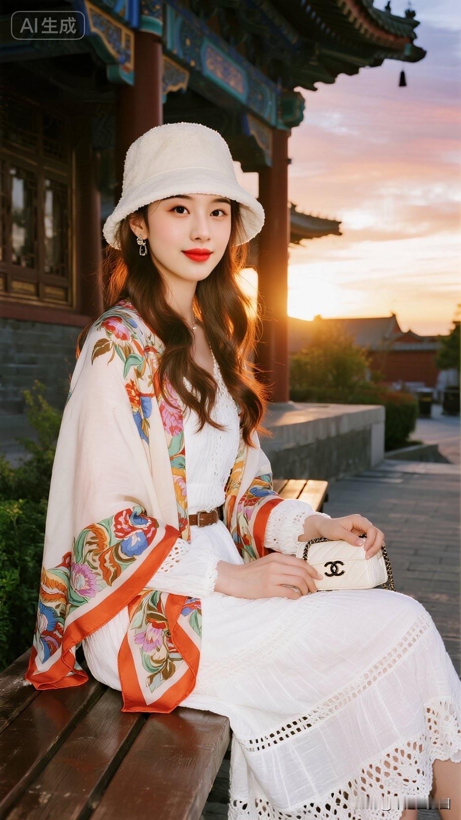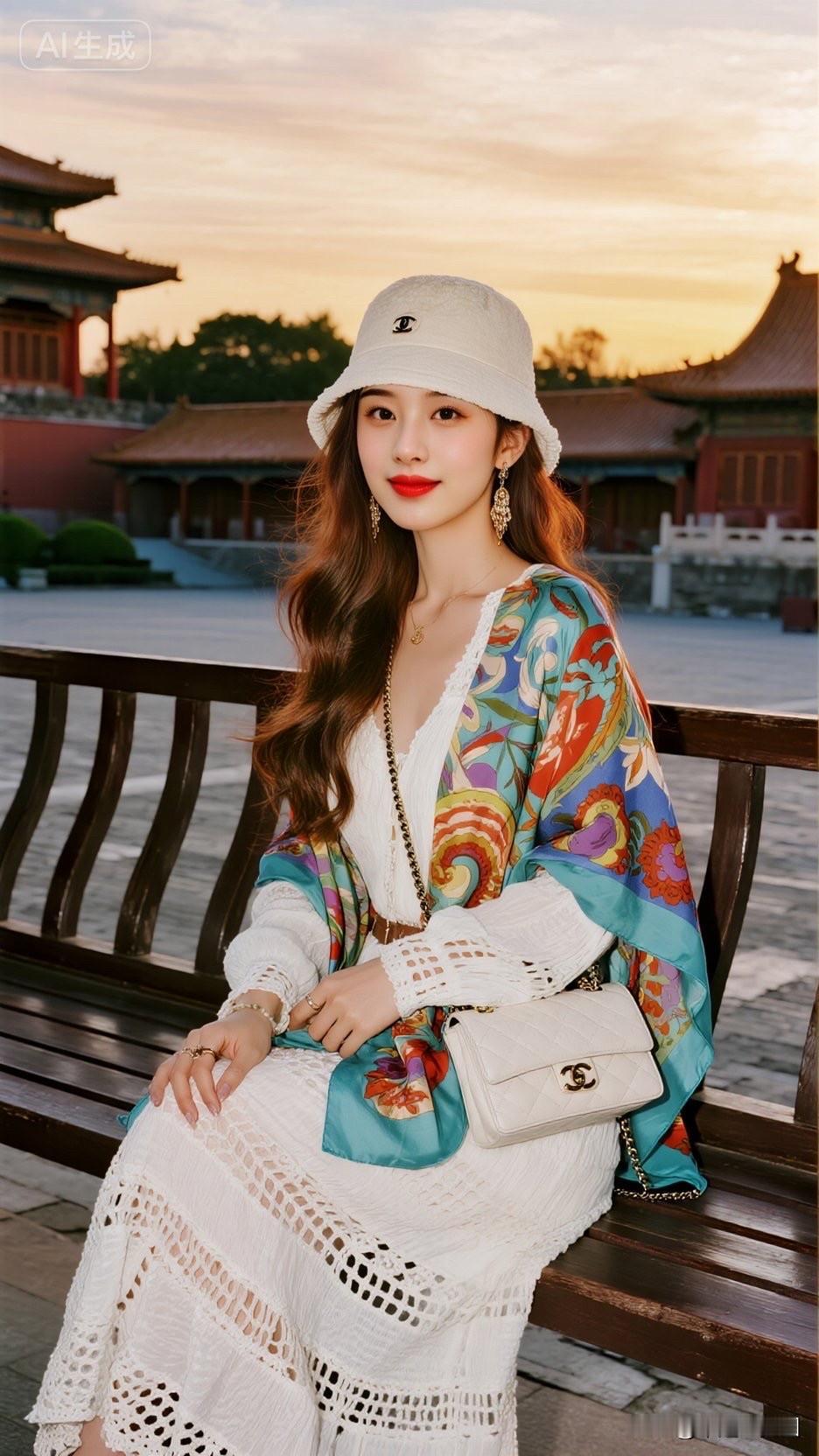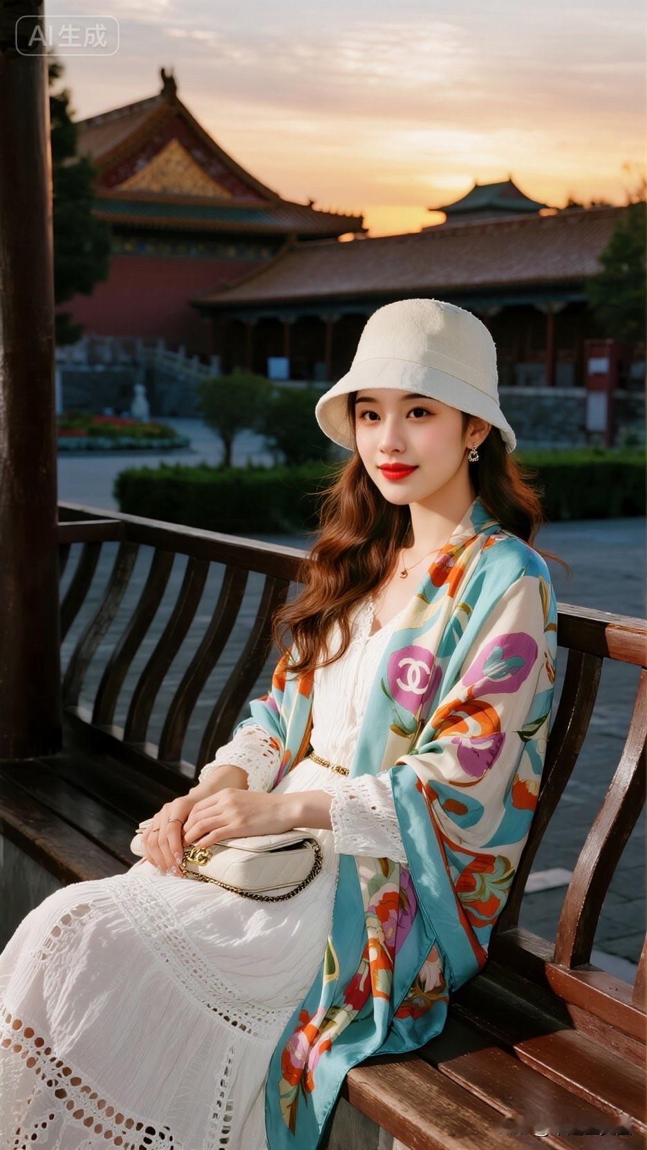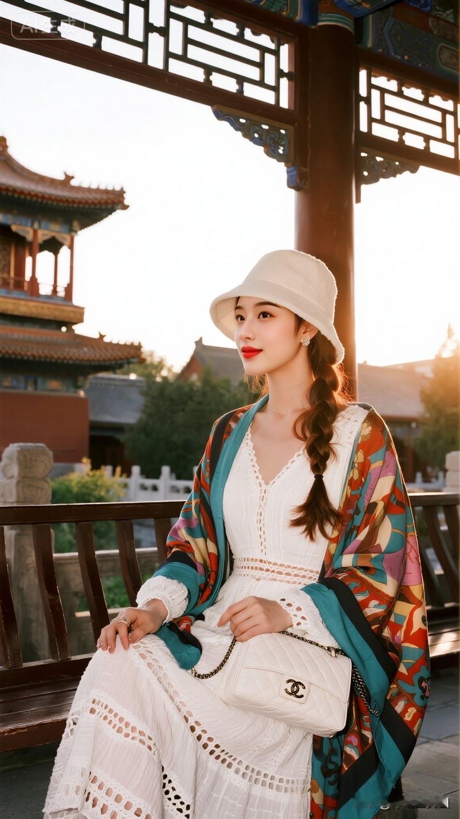 在故宫的秋日里,白色连衣裙搭配彩色披肩,优雅又时尚!