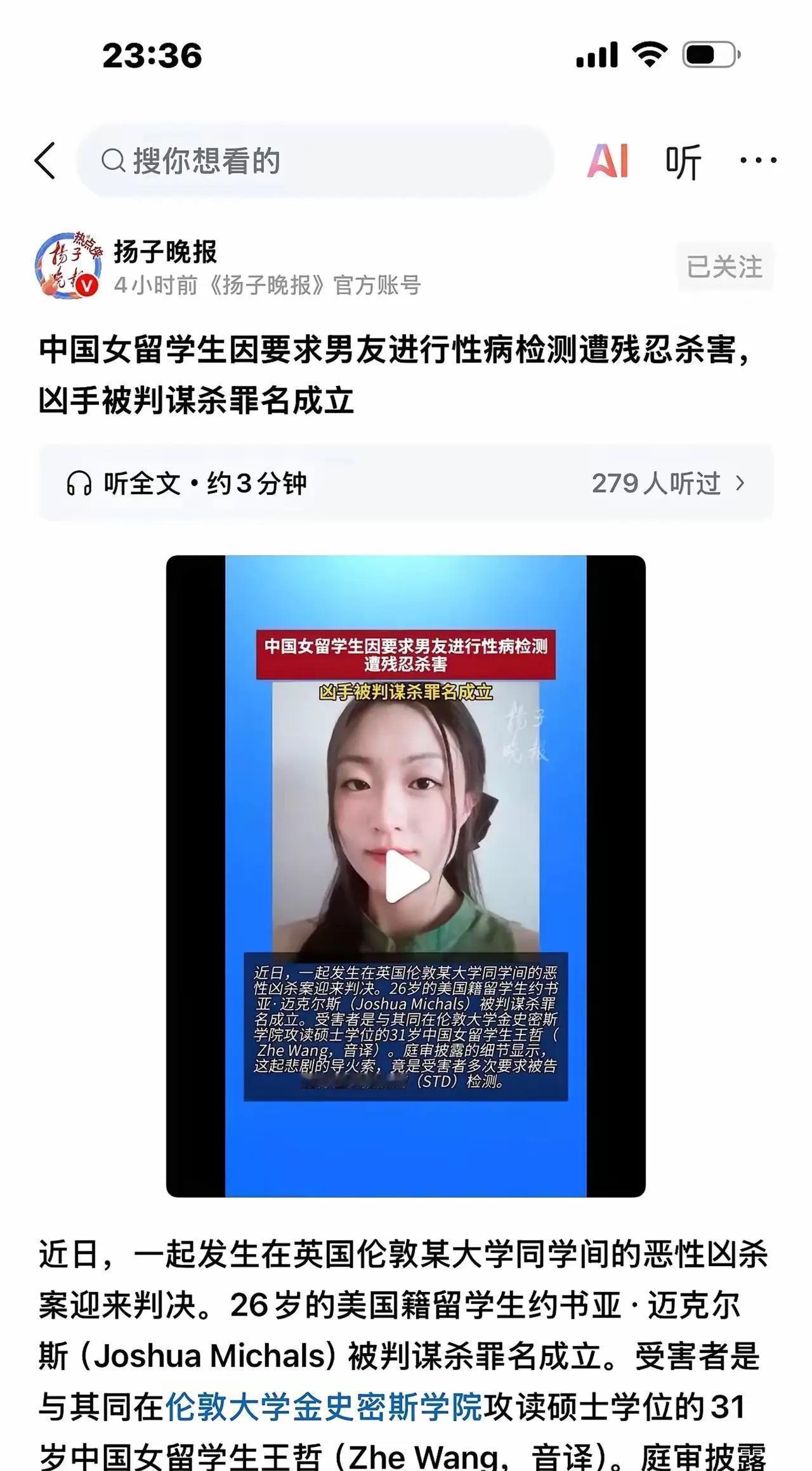 太可惜了,一个貌美如花的中国女生,因再三要求男友做性病检查,结果惨遭杀害,被勒死!这位31岁的中国女留学生叫王哲,照片中她穿着一件绿色的旗袍,长得清秀婉约,在英国伦敦大学读研究生时,2023年和26岁的美籍留学生约书亚相识。 为何一个关乎健康的合理诉求,会成为夺走生命的利刃? 王哲的伦敦公寓里,还放着来英时带的中医养生书——她总说“身体是革命的本钱,尤其在陌生的地方”。 朋友回忆,她曾笑着展示手机里的健康打卡记录,“连奶茶都只喝三分糖,怎么会在这种事上妥协?” 约书亚第一次被要求做检查时,正窝在沙发上刷手机,漫不经心地回了句“我们之间需要的是信任,不是化验单”。 王哲当时没再坚持,只是默默把桌上的情侣杯往自己这边挪了挪——那是她跑了三家店才找到的同款青花瓷杯。 第二次提起时,是在学校图书馆门口,秋风卷着落叶掠过约书亚的牛仔夹克,他突然提高音量:“你是在怀疑我不干净?” 周围有同学侧目,王哲攥紧了书包带,指甲掐进掌心:“我不是怀疑你,是对我们俩负责,我可以先去做。” 约书亚没接话,转身走向地铁站,留给她一个带着寒意的背影。 矛盾真正爆发的那个傍晚,王哲刚从医院取回自己的体检报告,微信里给约书亚发了条消息:“我的报告没问题,你的预约截图发我一下好吗?” 三个小时后,约书亚出现在她公寓门口,手里捏着一瓶威士忌,眼神通红。 邻居听到争吵声时,窗外的晚霞正把天空染成血红色——“你到底在怕什么?”“你根本不懂什么是信任!”“这不是信任,是自欺欺人!” 然后是重物倒地的闷响,和短暂的、令人窒息的安静。 “文化差异不是遮羞布,”有网友在评论区敲下这句话,“当一方把‘自我保护’视作‘不信任’,悲剧就埋下了种子。” 王哲的朋友圈停留在遇害前三天,晒的是伦敦眼夜景,配文“希望所有相遇都能被真诚对待”。 “男人守国门,女人守血脉”的说法或许极端,但“不同价值观碰撞时,底线必须清晰”的提醒,却让无数人沉默。 有留学生在论坛留言:“在国外更要懂‘筛选’,不是所有‘爱情’都值得交付真心——王哲的悲剧,是对‘盲目信任’最痛的警示。” “我们的教育里,是不是少了‘如何识别危险信号’这一课?”另一条评论被顶到热评,“教接轨,也要教扎根;教开放,更要教设防。” 约书亚在法庭上辩解“是激情杀人”,可王哲旗袍领口绣着的那朵小兰花,永远停留在了未绽放的模样。 那些说“涉外婚姻失败是必然”的声音里,藏着多少本可避免的遗憾? 王哲的导师回忆,这个总带着温吞笑意的姑娘,曾在论文里写“差异可以被理解,但不能被牺牲”——只是她没料到,自己会成为这句话最沉重的注脚。 欲望与虚荣或许会让人迷失,但对健康的坚持、对底线的守护,从来不该是被指责的“多疑”。 伦敦大学的梧桐叶落了又生,再也等不到那个穿着绿色旗袍、抱着书本走进教学楼的中国女孩了。
