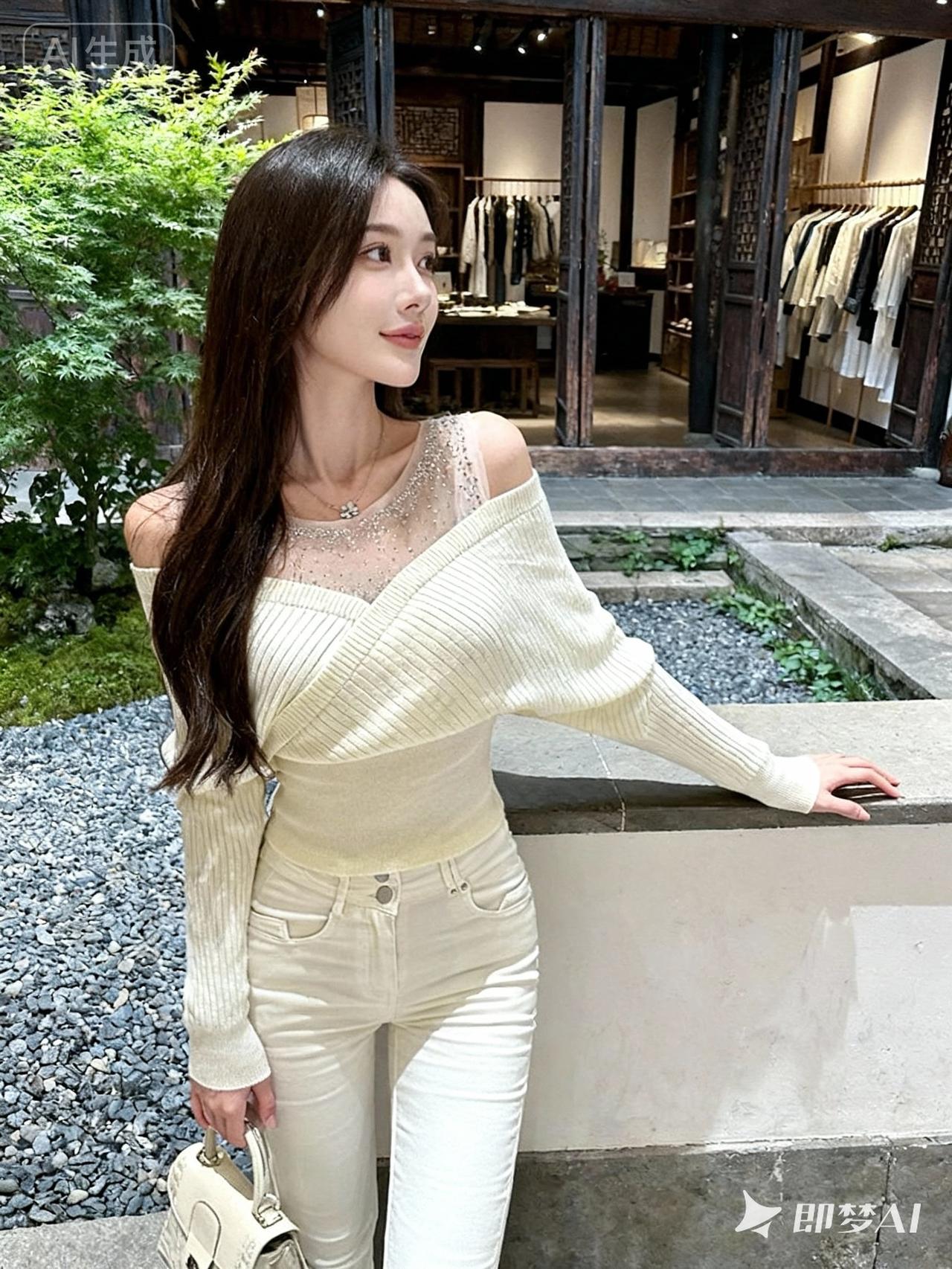 一位年轻的中国美女,鹅蛋脸,精致的五官,大眼睛,化着温柔的纯欲妆容,唇色是浅豆沙
