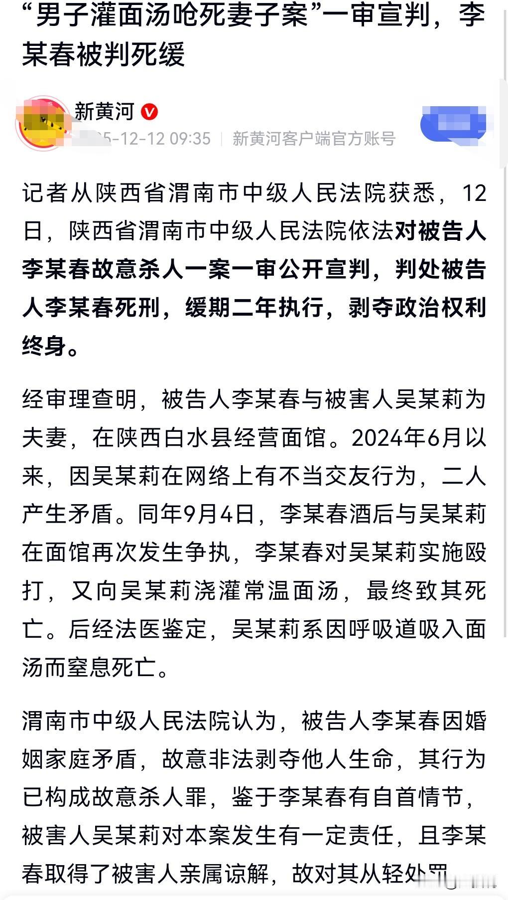 一审终于判了。 12月12日消息,灌面汤杀妻案一审宣判,凶手被判死缓。 这个案件引发很大的争议。 为什么判死缓?法院方面认为女人在网上有不当交友的情况。 让我费解的是,没想到被害人的家属竟然选择原谅。 这被害人的家属有什么资格替死者原谅? 我不相信死者会选择原谅杀她的人。 男子应该被判死刑。