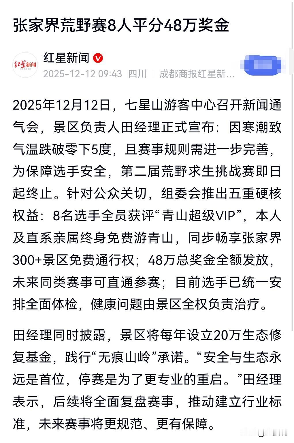 这真的是皆大欢喜呀,这8个人个个都是赢家。 由于天气寒冷的原因,以免造成选手身体的问题。 张家界荒野赛8人平分48万奖金,每个人平分6万。 这真的是爽歪歪的一件事情。 这几个人真是名利双收啊。 像那个林北,都快成人生赢家了。 又有美女相伴,名利双收。